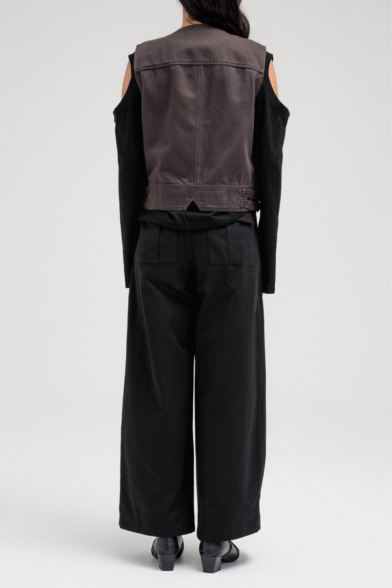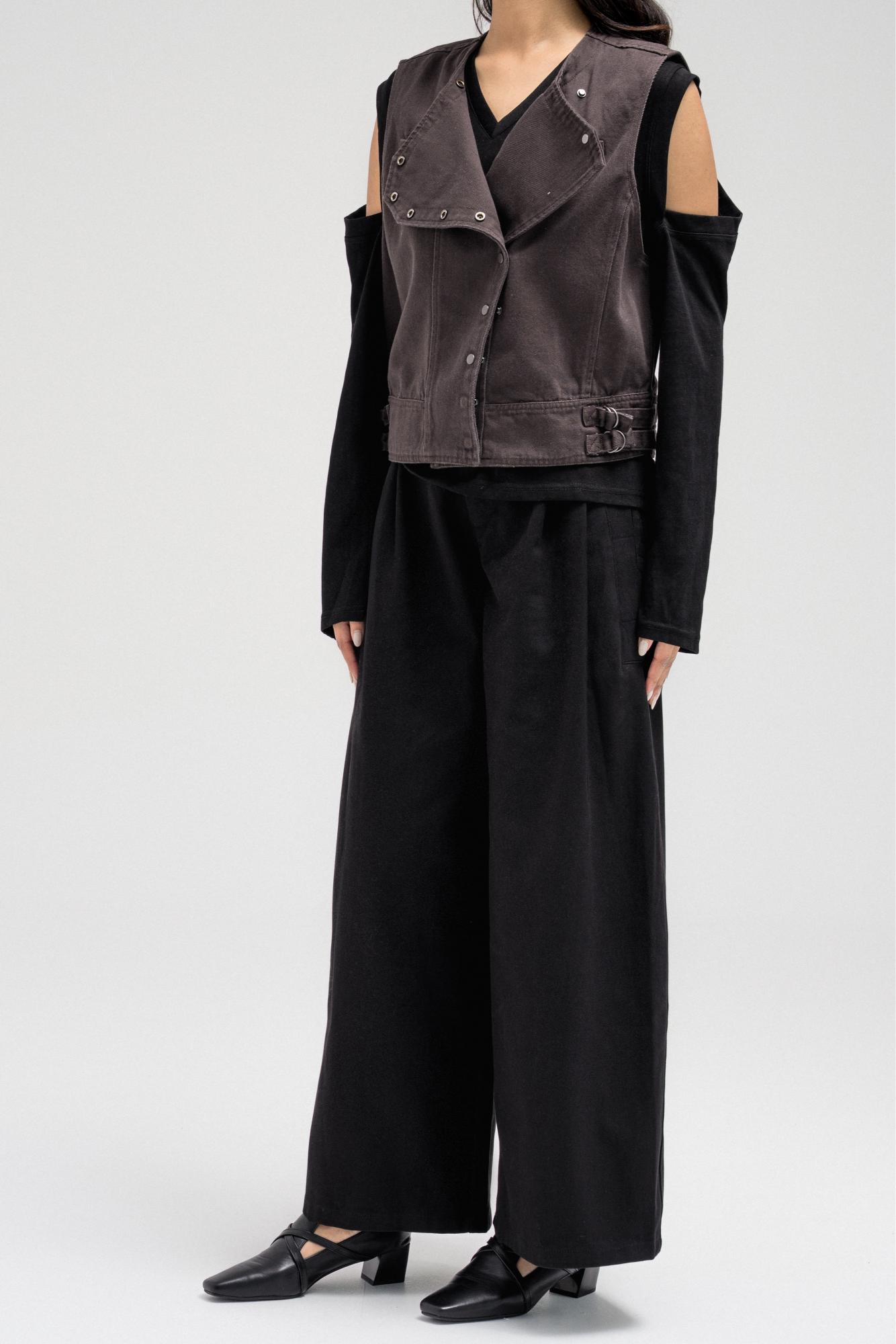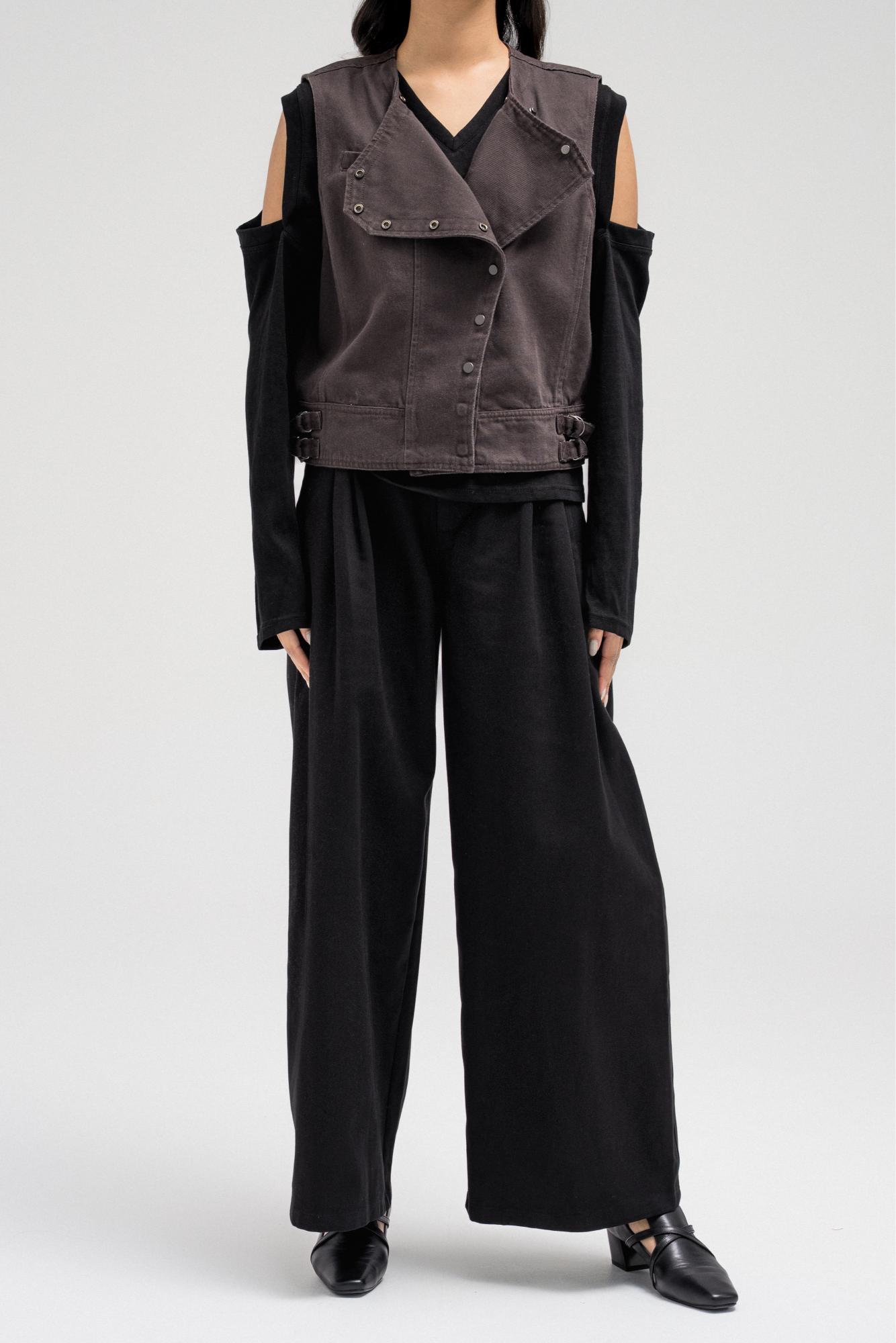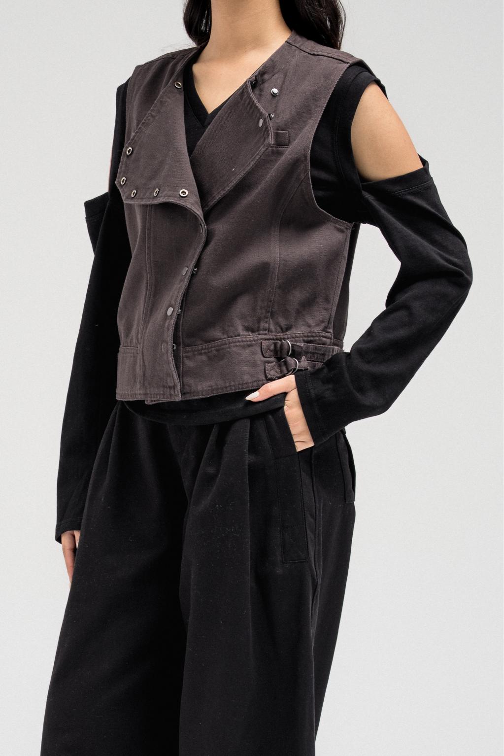 Sleeveless vest designed with an asymmetrical front panel and snap-button closure. Features adjustable side tabs for a customizable fit.