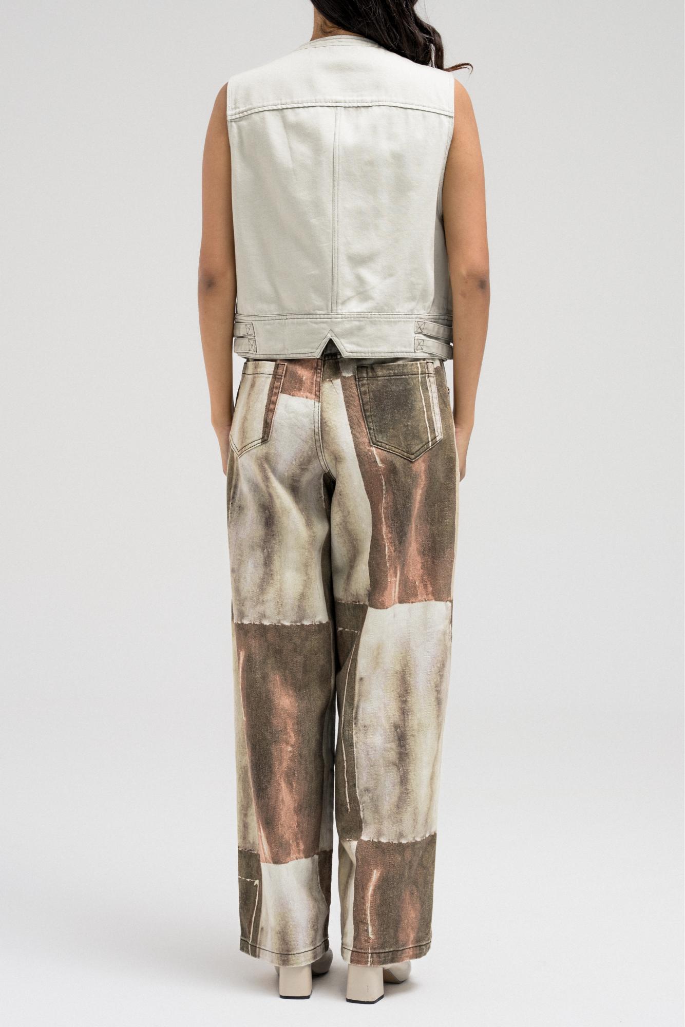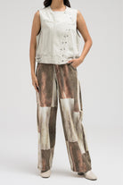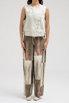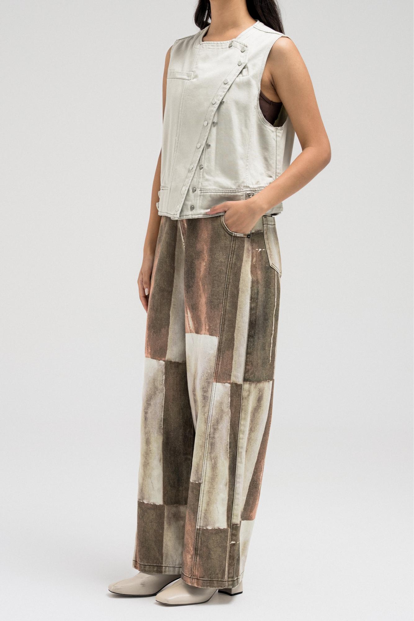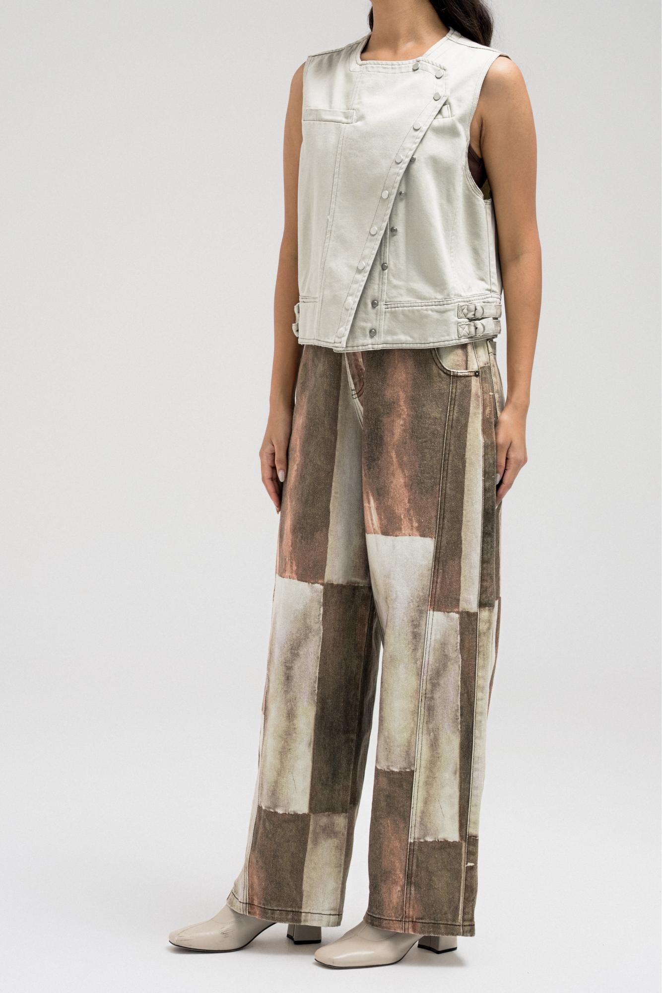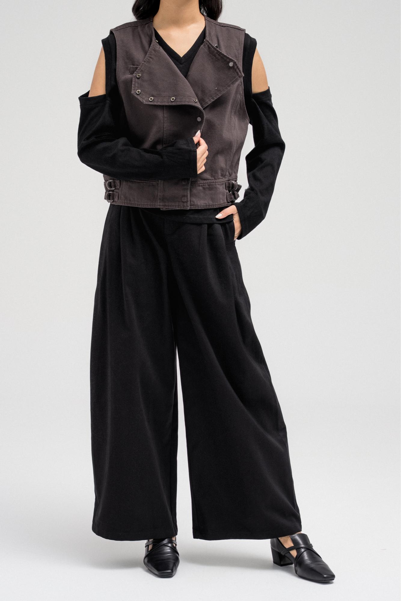 Sleeveless vest designed with an asymmetrical front panel and snap-button closure. Features adjustable side tabs for a customizable fit.
