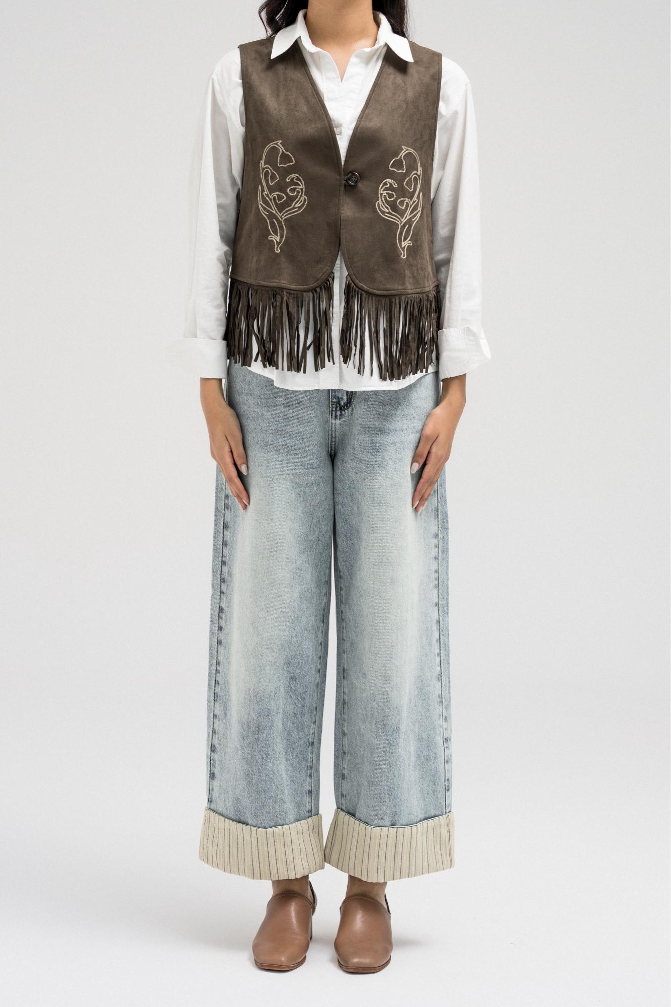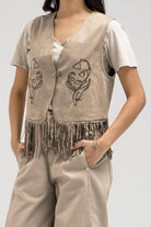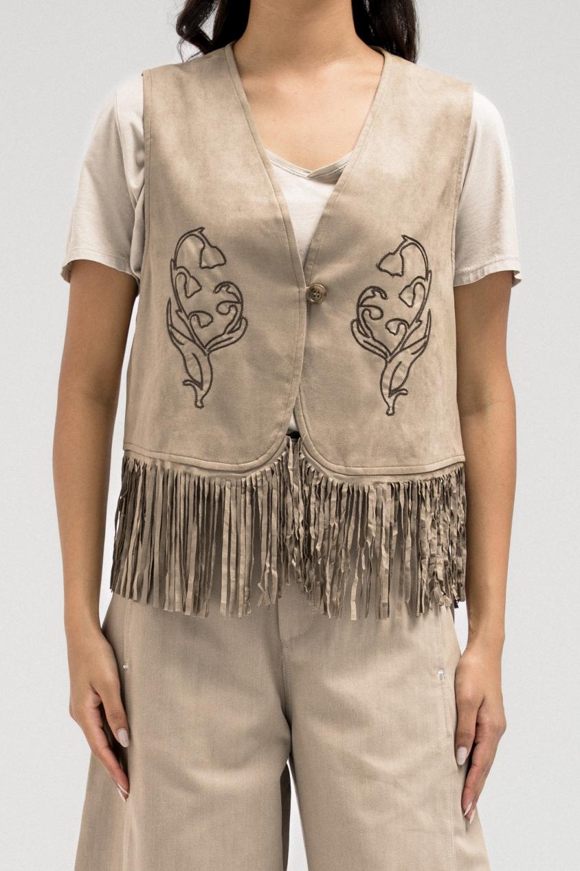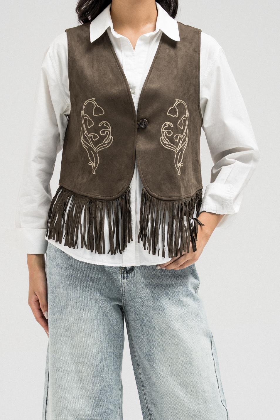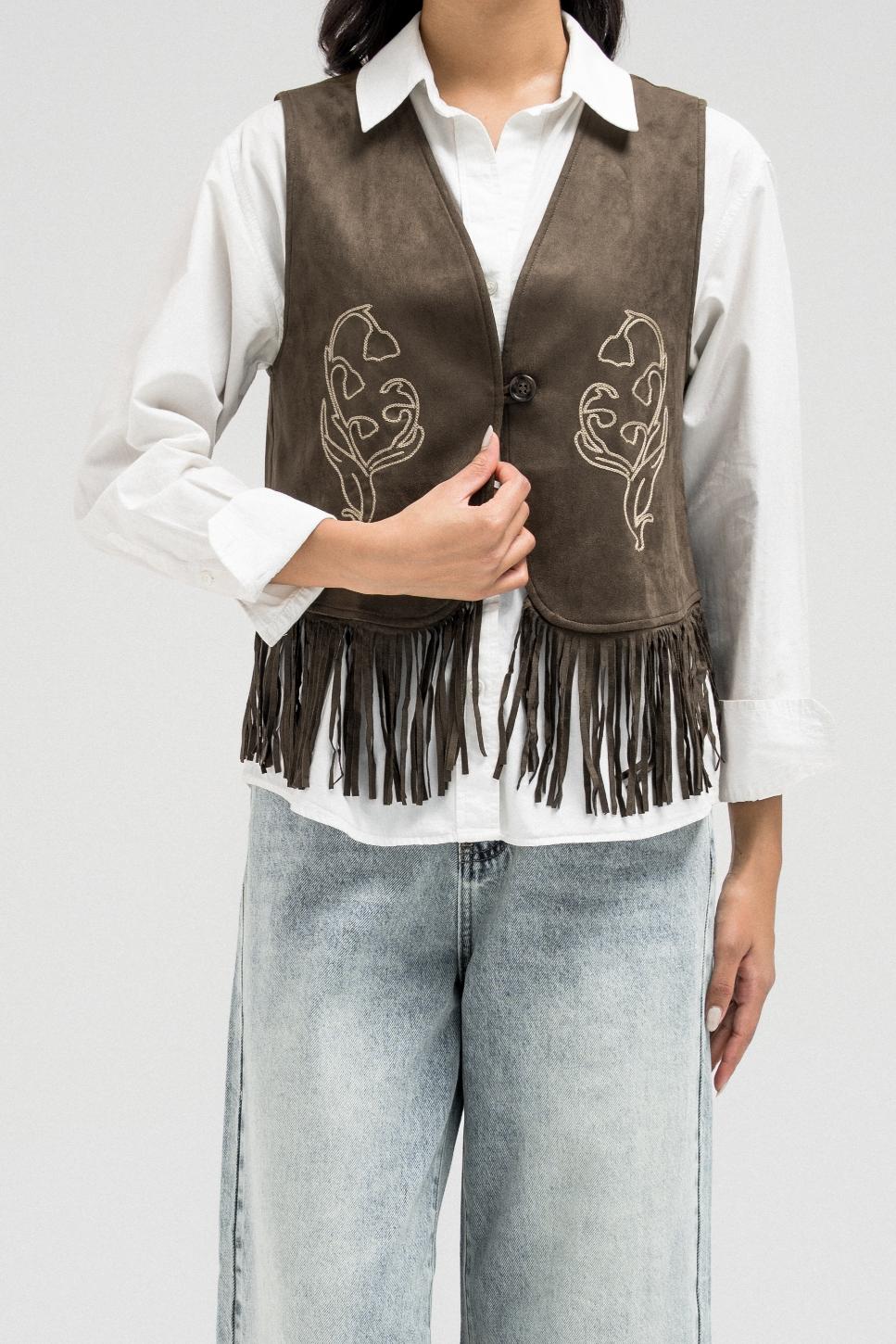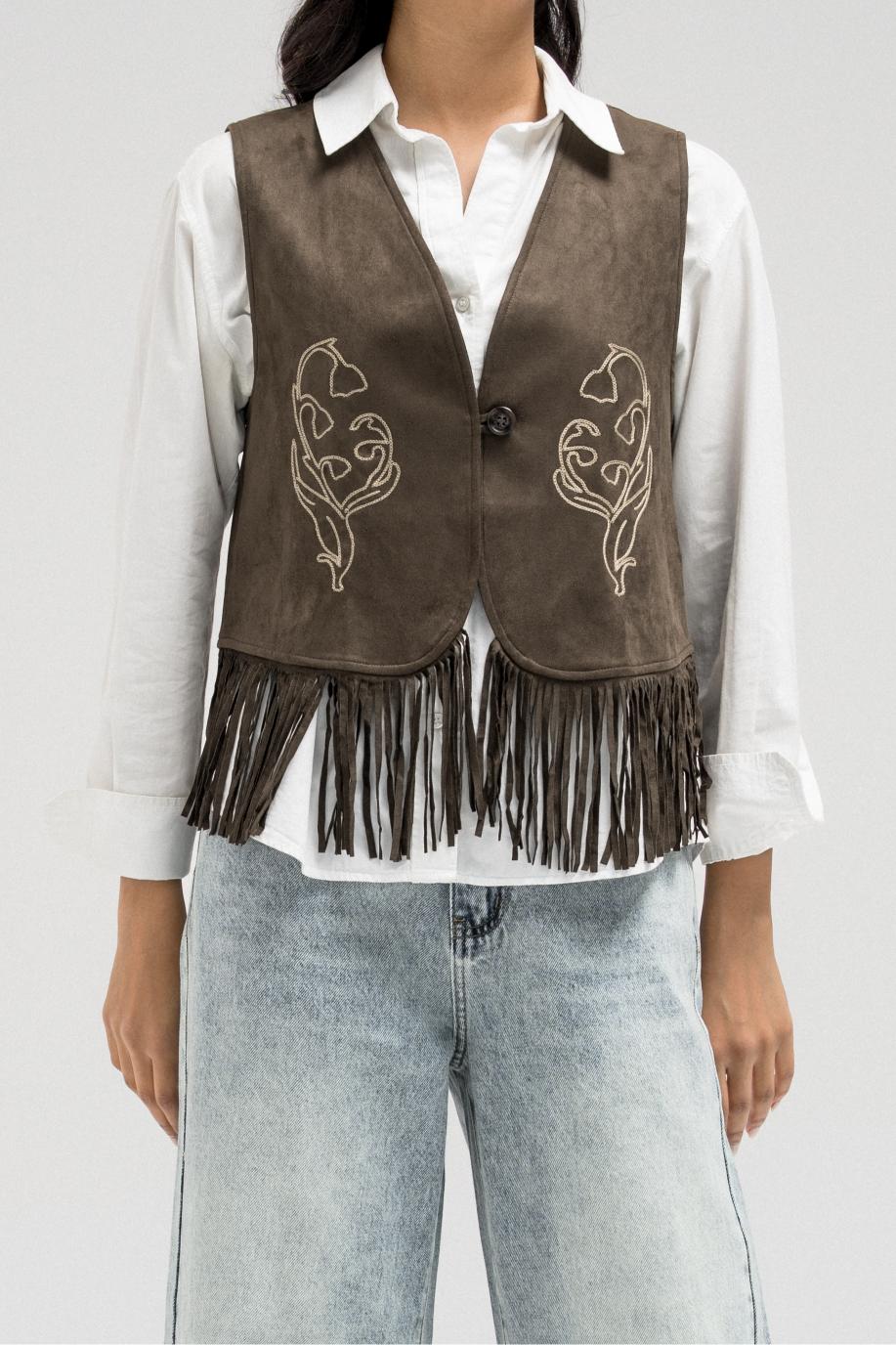 Sleeveless suede vest featuring stitched embroidery at the front and a single front button closure. Finished with tassel detailing along the hem for a bohemian-inspired look.