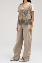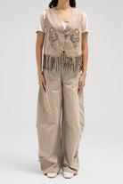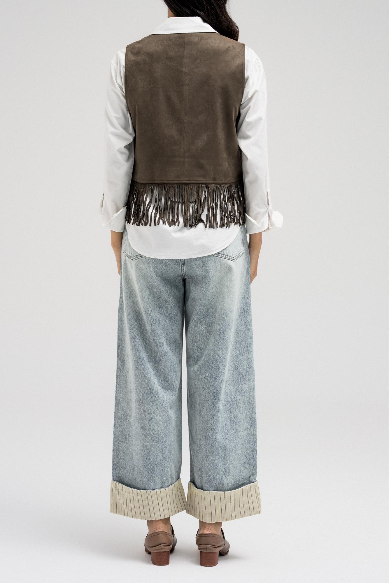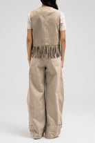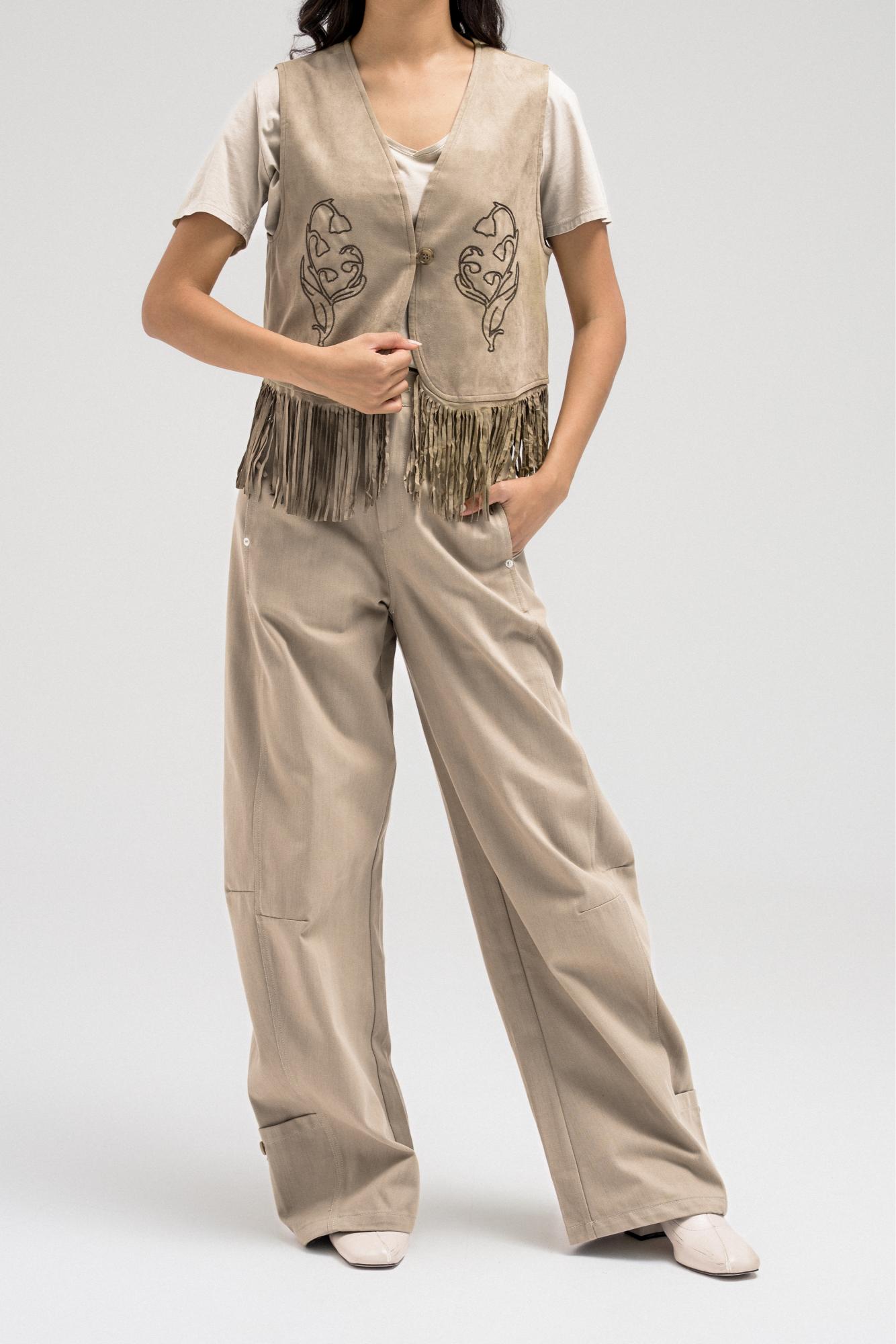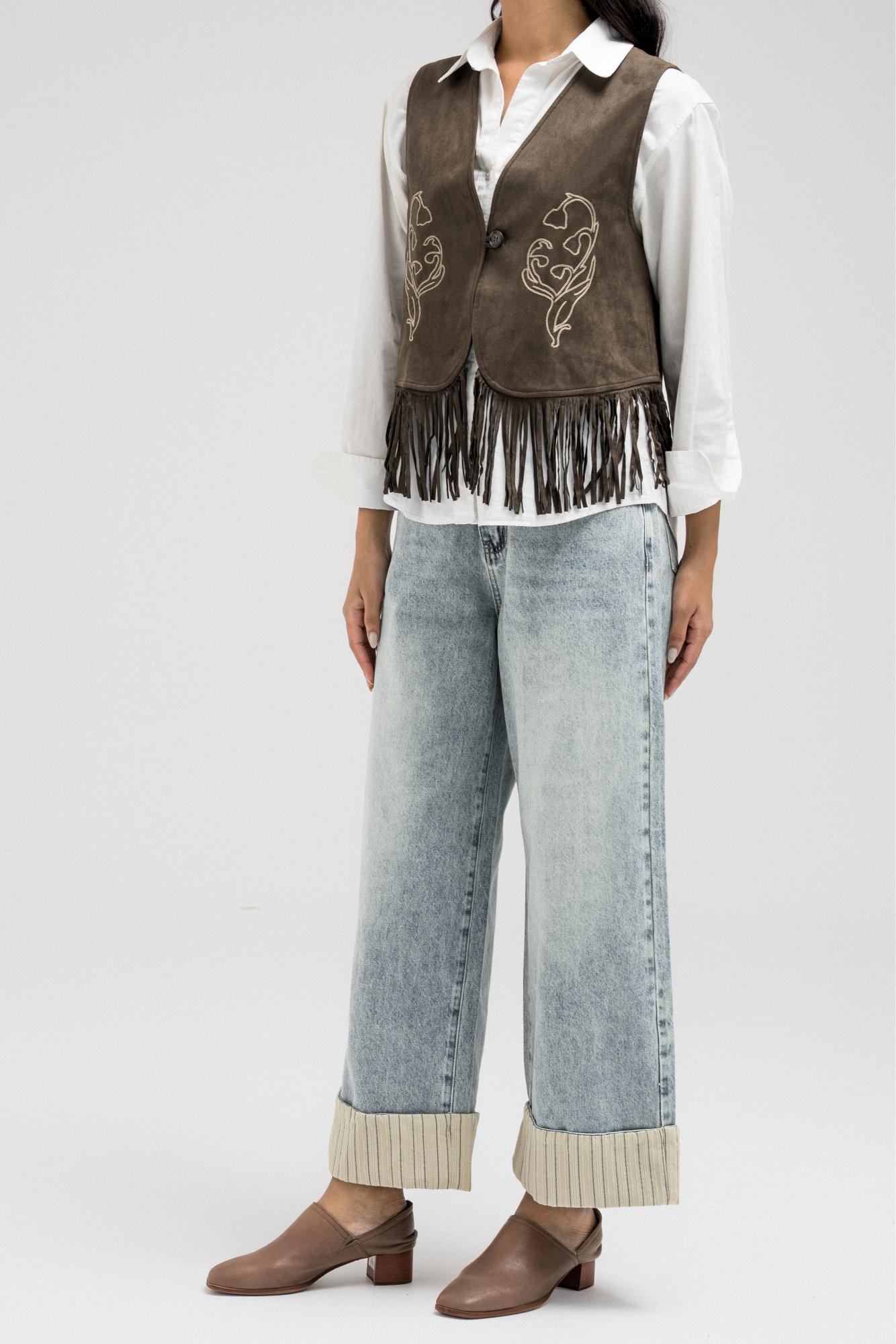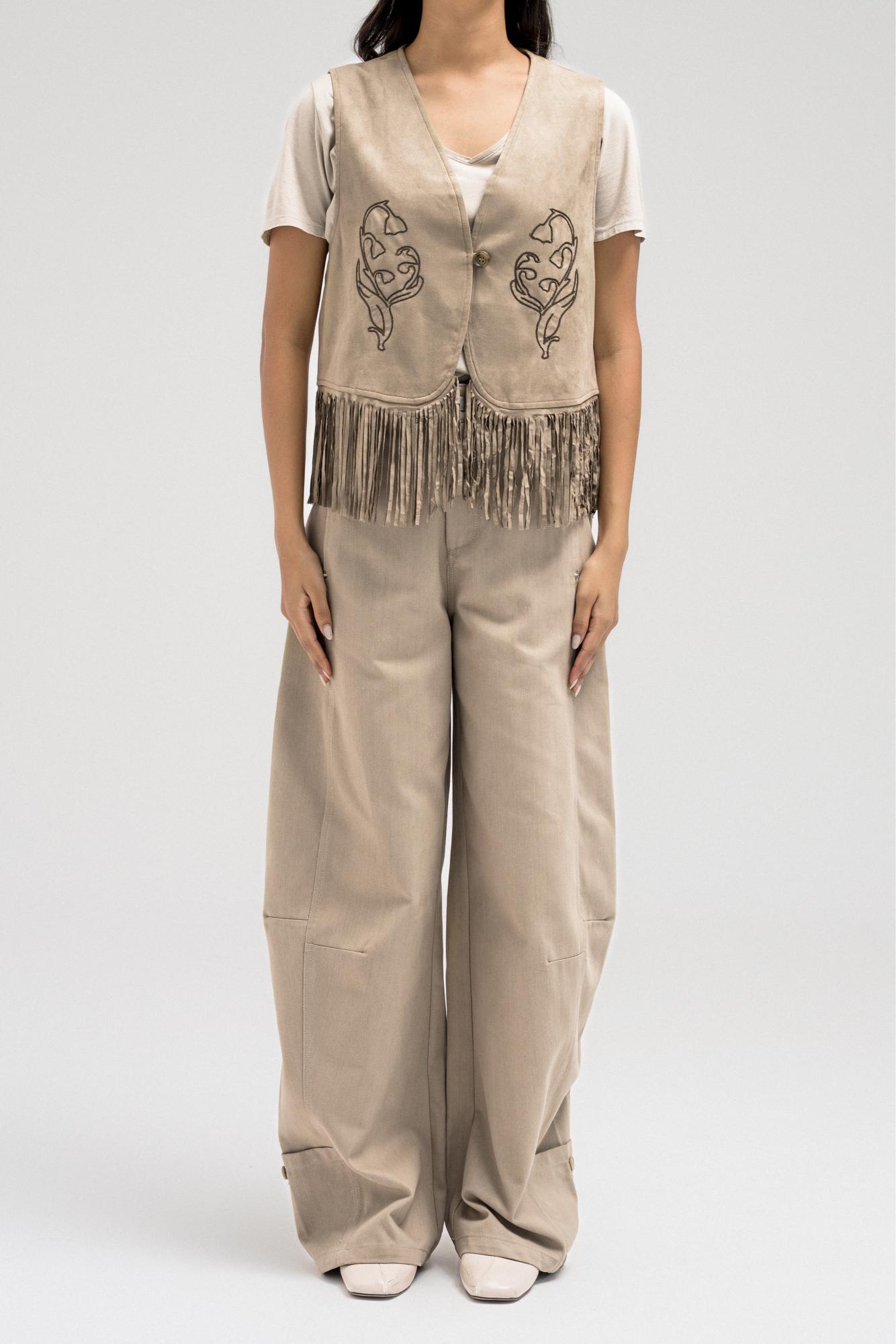 Sleeveless suede vest featuring stitched embroidery at the front and a single front button closure. Finished with tassel detailing along the hem for a bohemian-inspired look.
