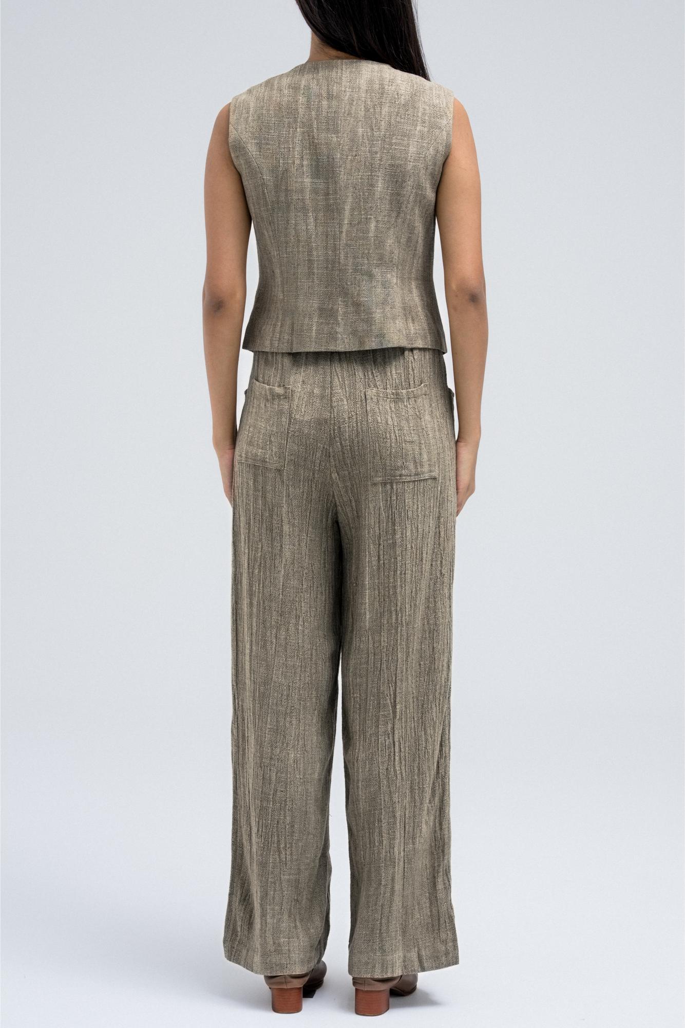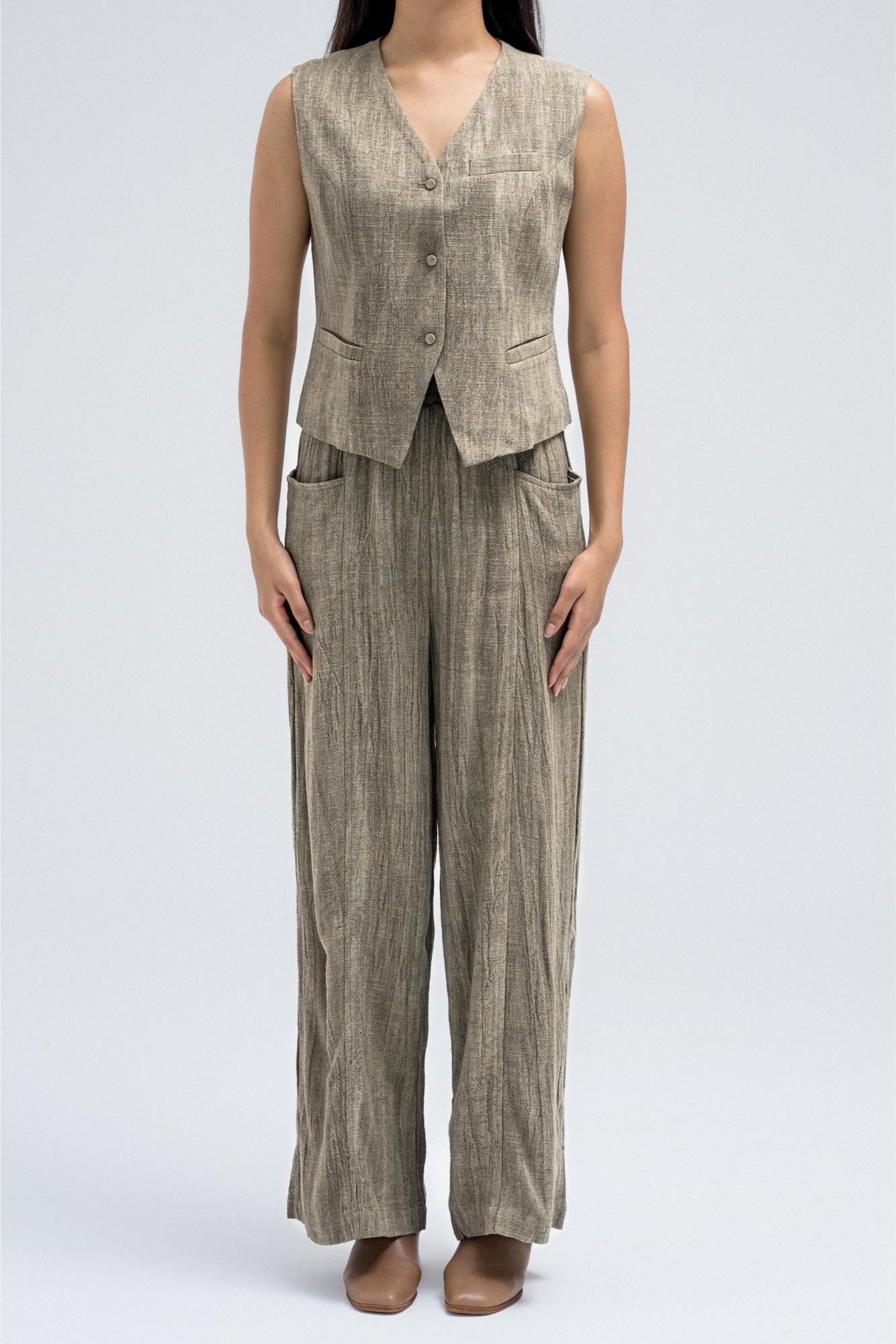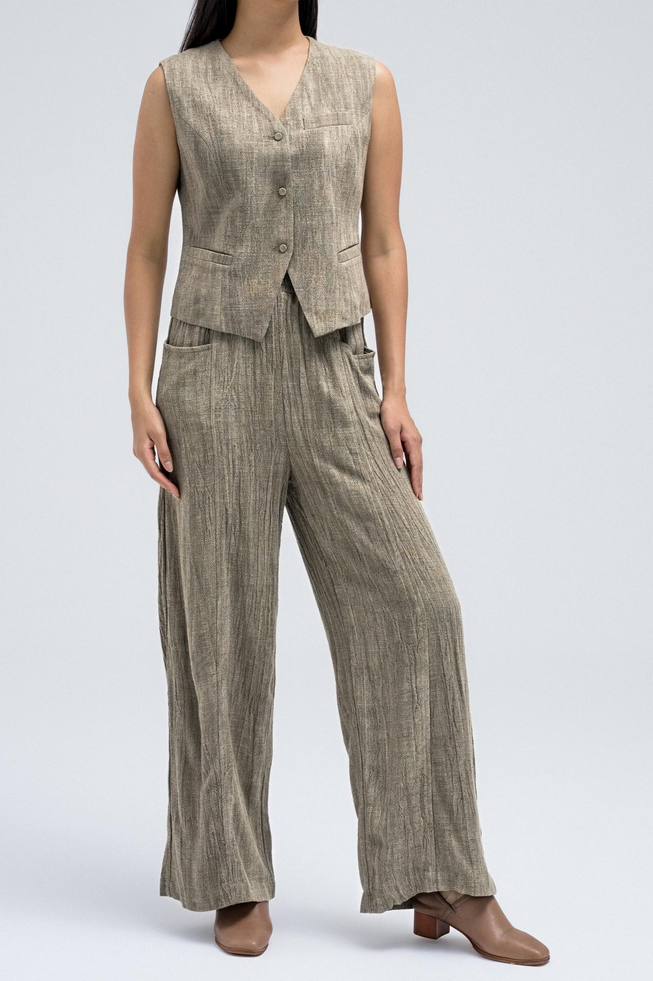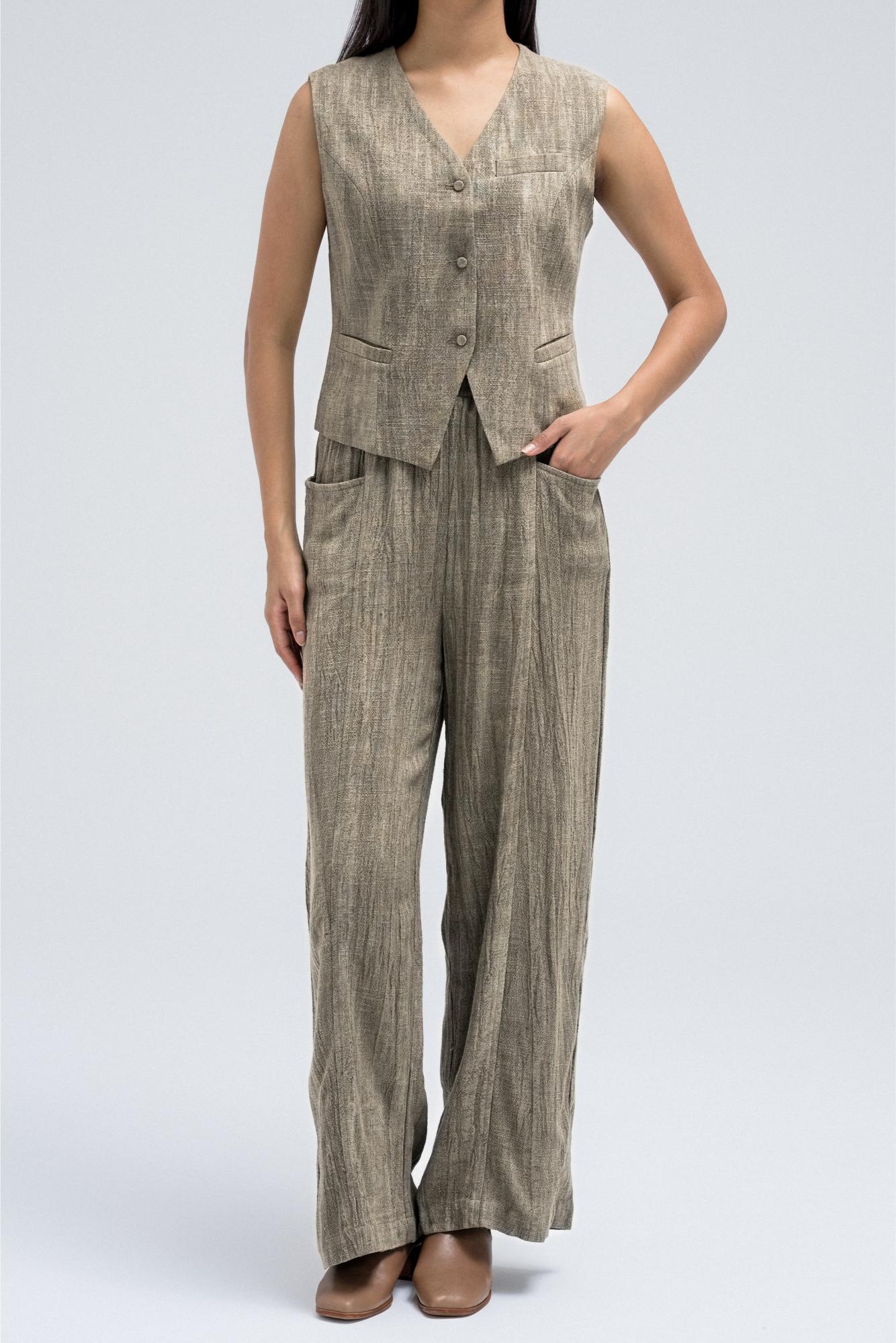 Sleeveless vest featuring a textured design with front button closure and small welt pockets. A versatile layering piece that pairs perfectly with the matching blazer and pants for a complete set.