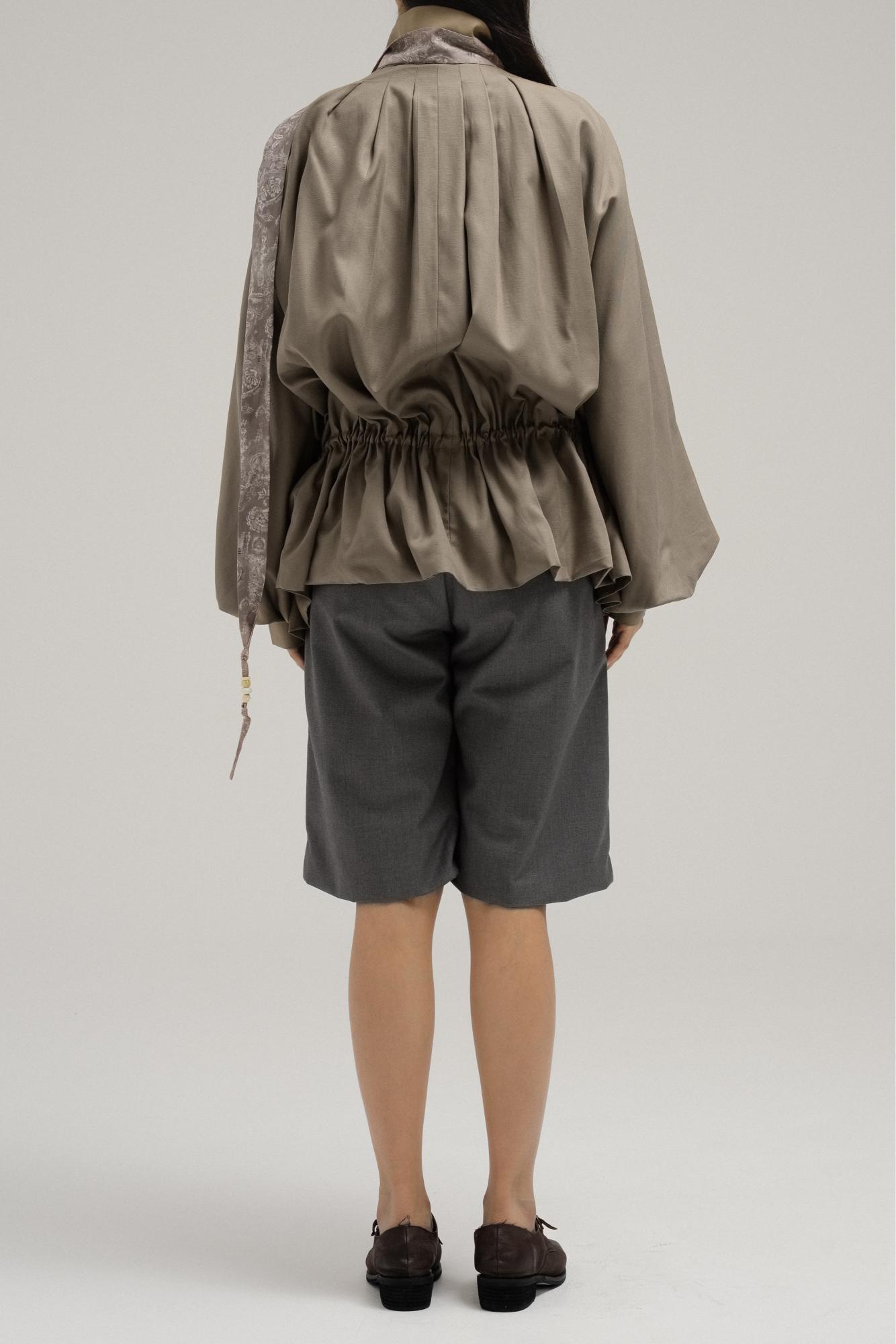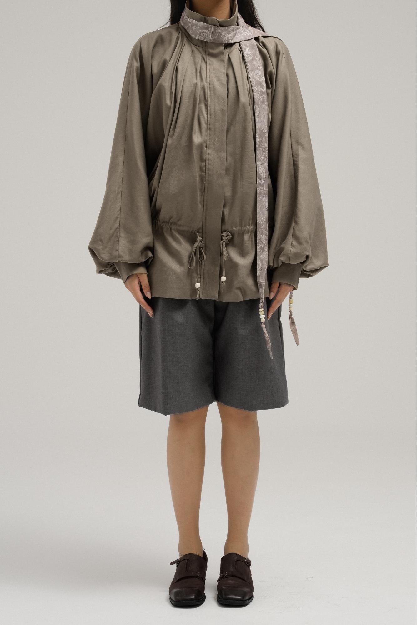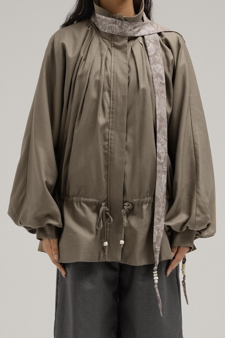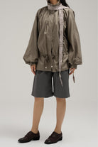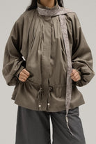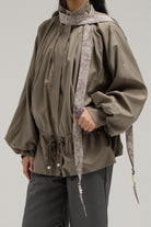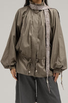 This jacket is designed with a voluminous, puffy silhouette that can be adjusted using the built-in drawstrings for a customizable fit. The long sleeves are slightly puffy with gathered cuffs, adding to the soft, oversized effect. It features a front zipper closure and comes with a versatile scarf belt that can be tied, removed, or styled in multiple ways.