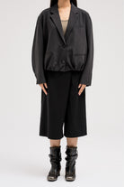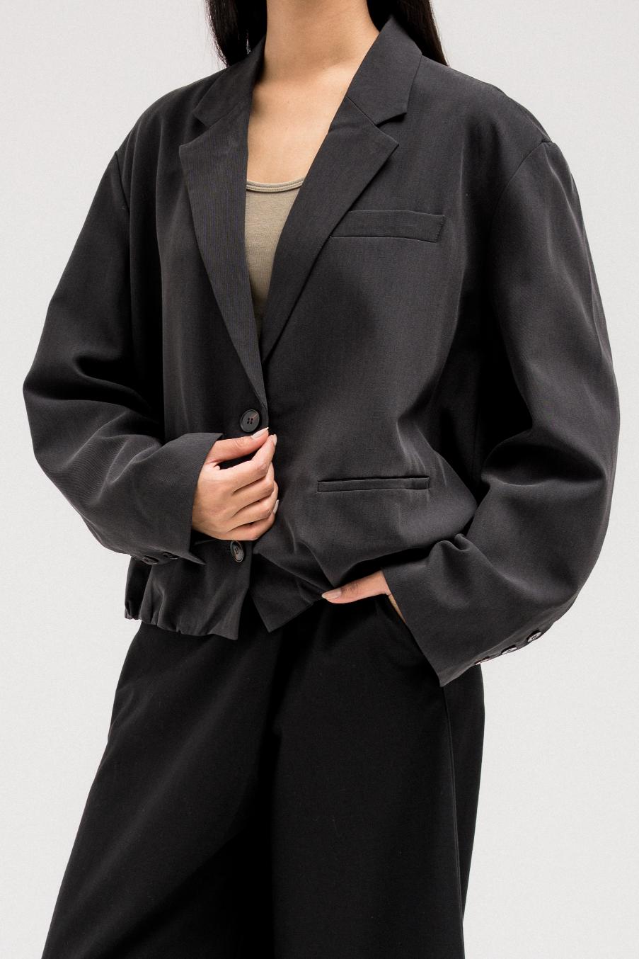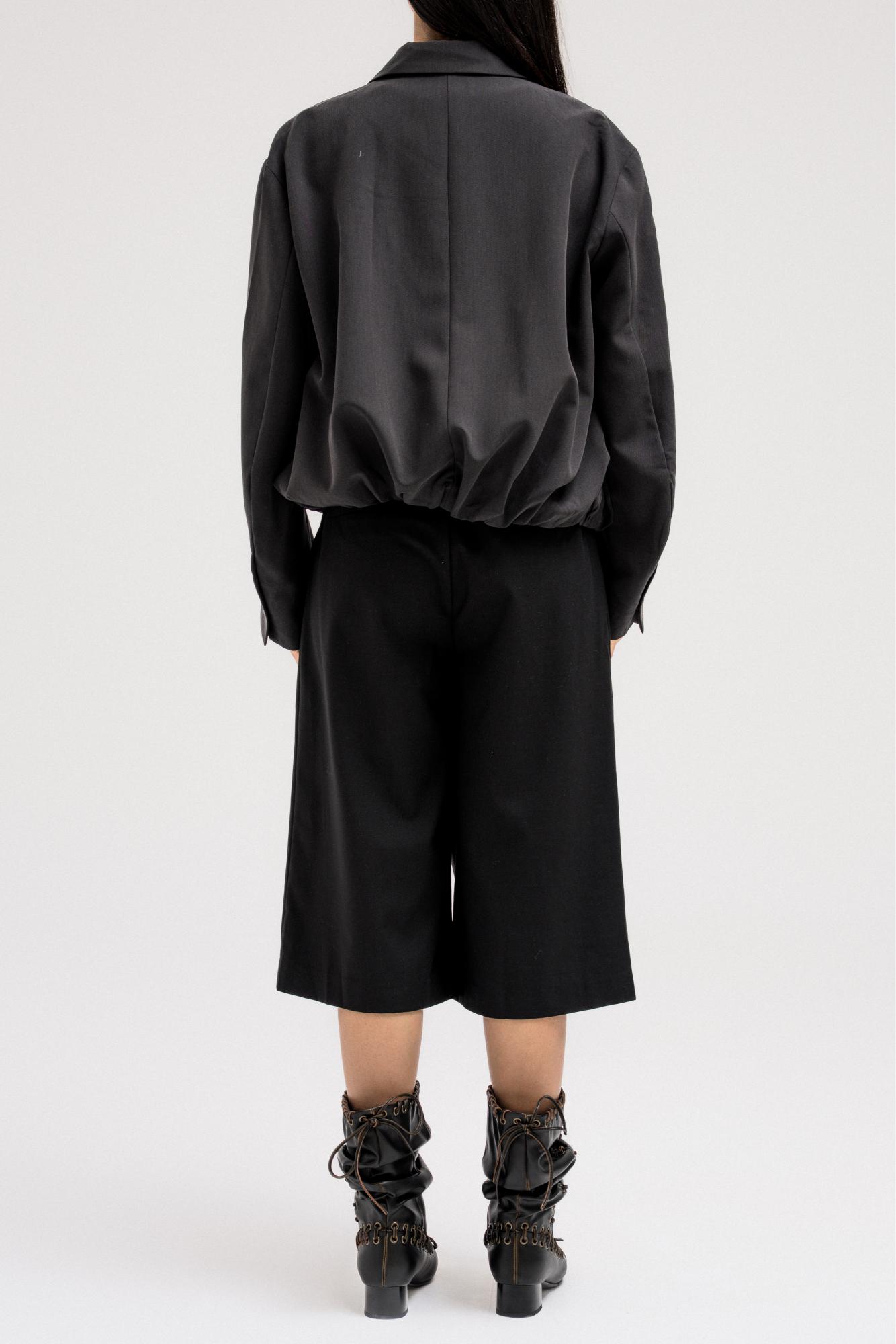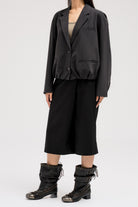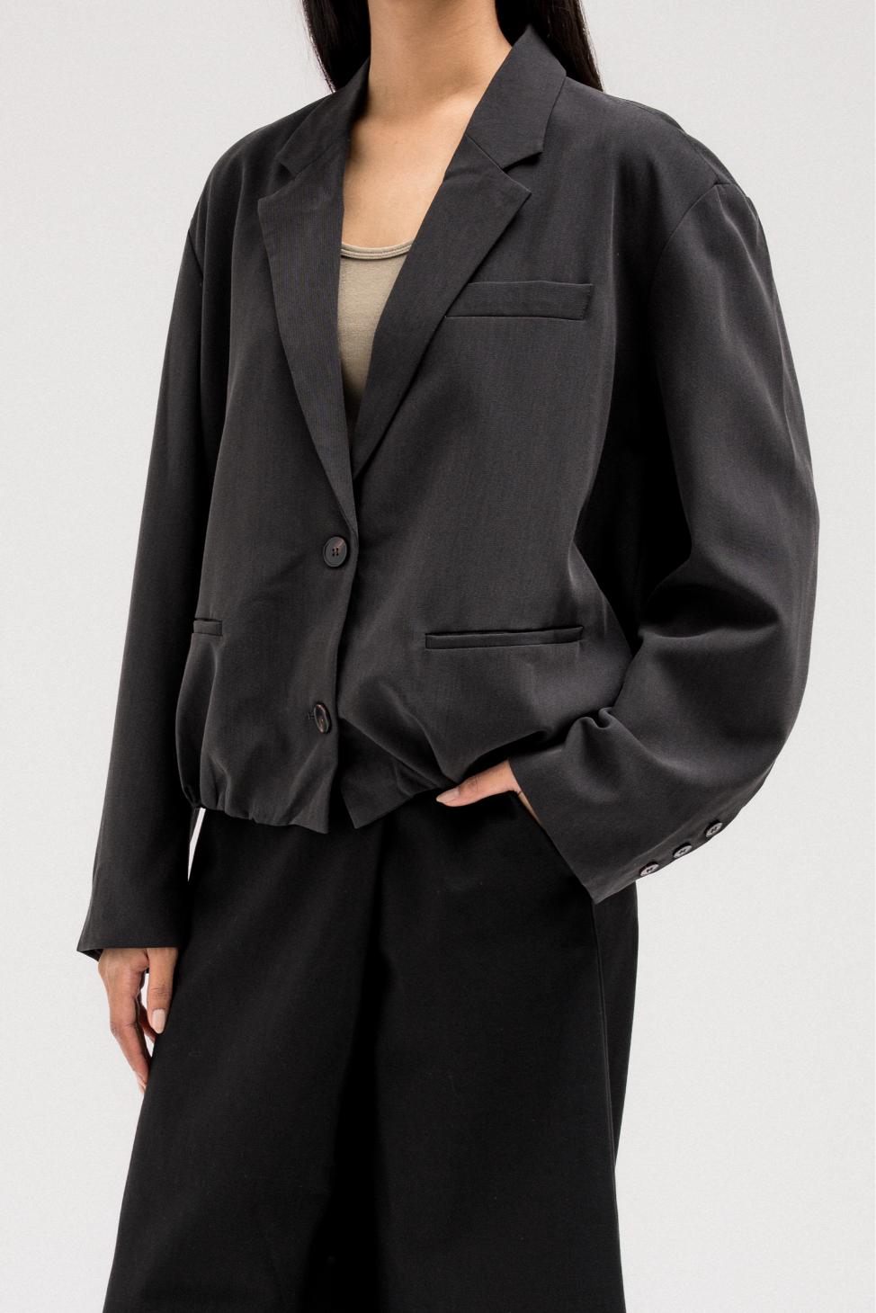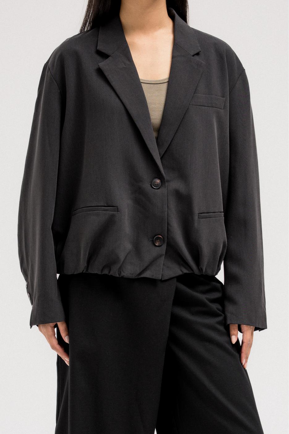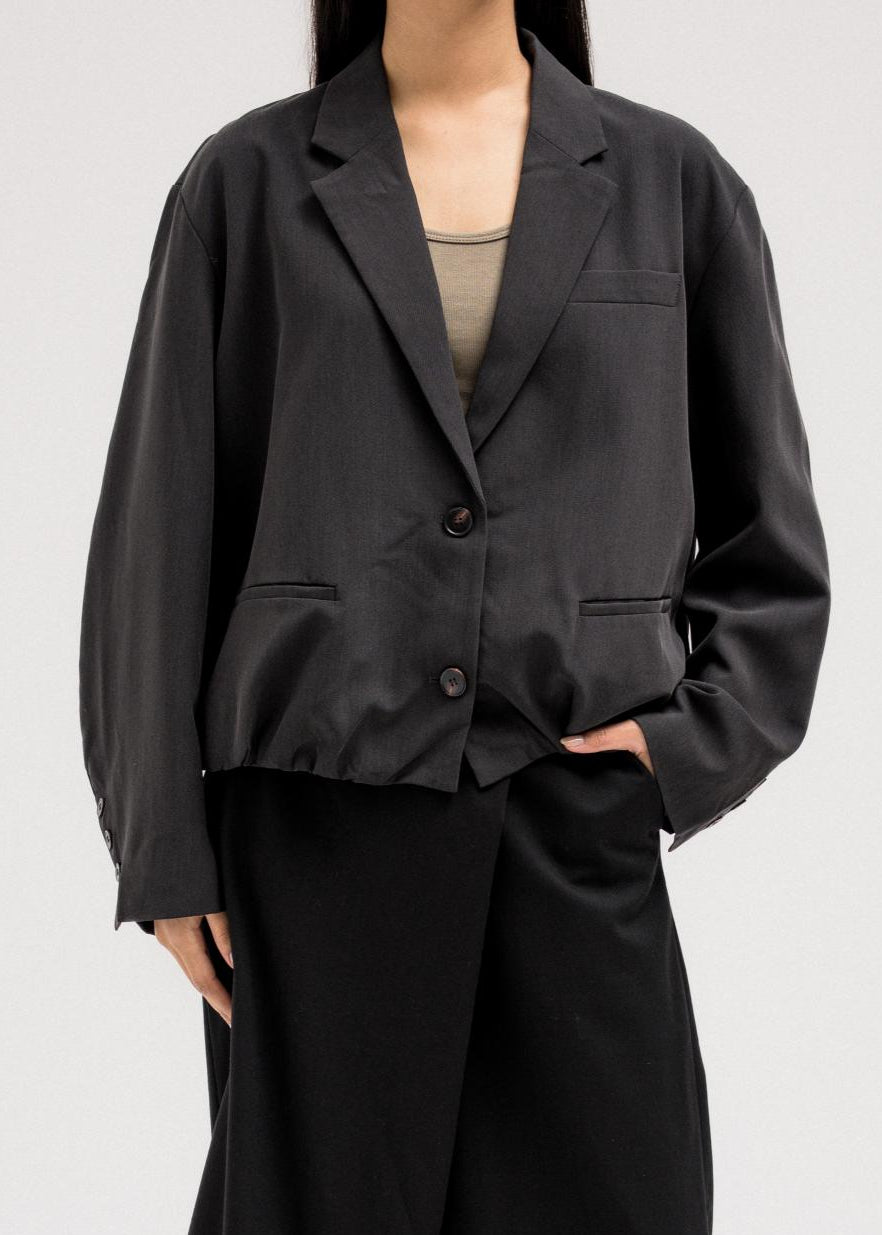 This blazer reimagines classic tailoring with a modern twist. It features a slightly cropped cut balanced by an elasticated hem that creates a subtle cinched effect, adding shape and a contemporary edge to the silhouette. Designed with a single-breasted button closure and a sharp classic collar.
