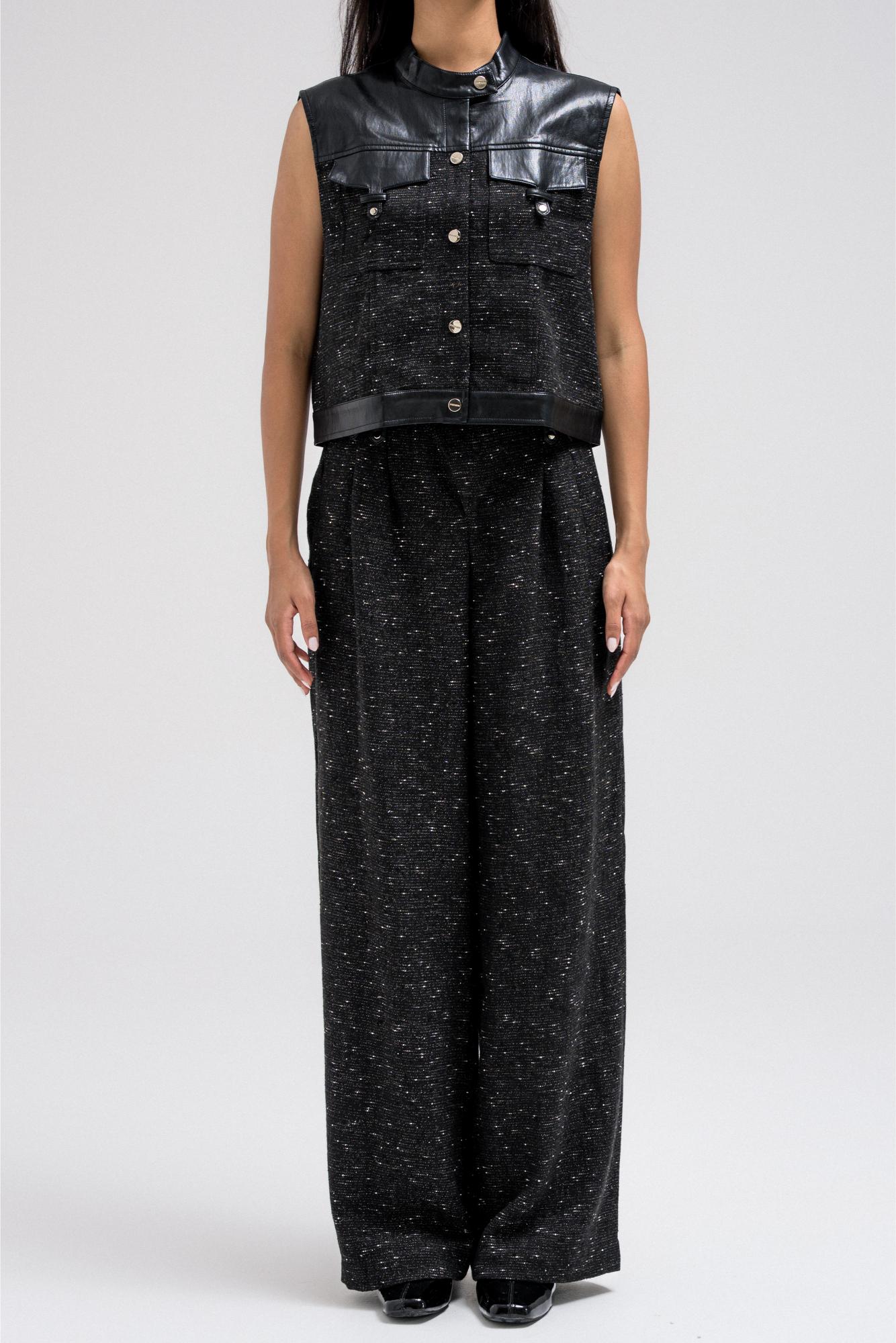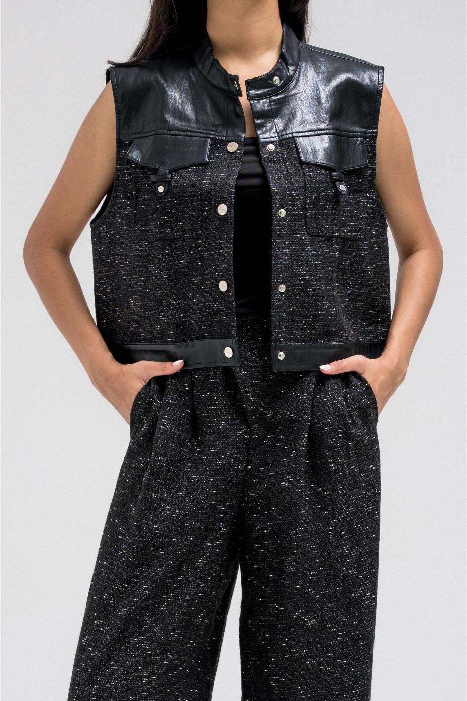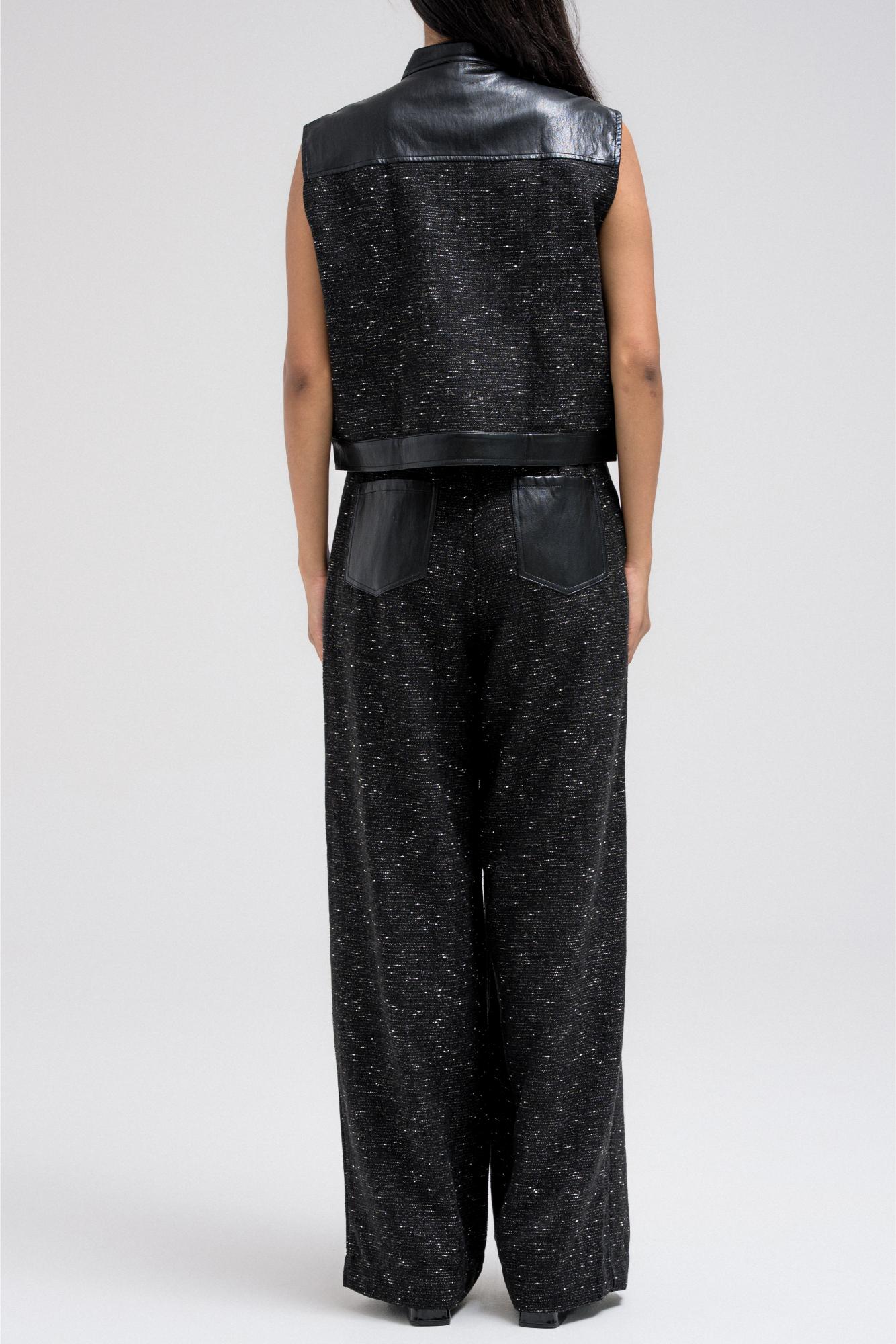 This vest combines sleek leather at the front with a contrasting patterned fabric at the back, giving it a unique two-tone effect. Designed with a front zipper closure, it balances edgy sophistication with modern versatility. Pair it with its matching pants for a complete statement look.