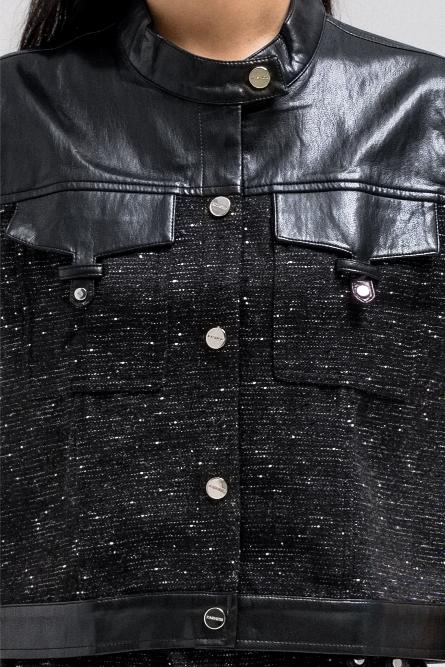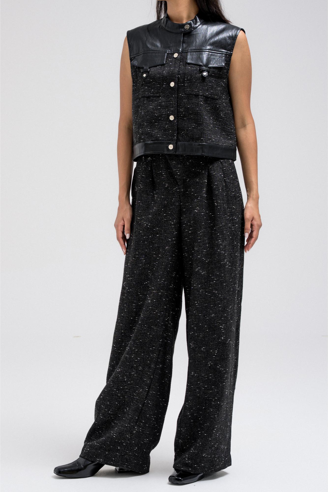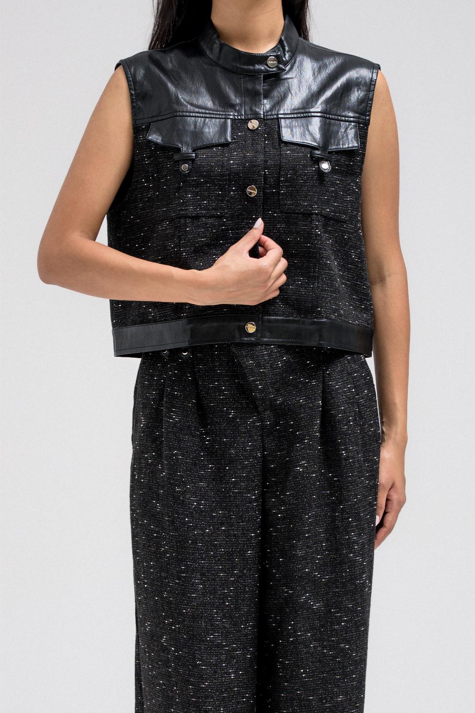 This vest combines sleek leather at the front with a contrasting patterned fabric at the back, giving it a unique two-tone effect. Designed with a front zipper closure, it balances edgy sophistication with modern versatility. Pair it with its matching pants for a complete statement look.