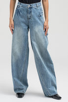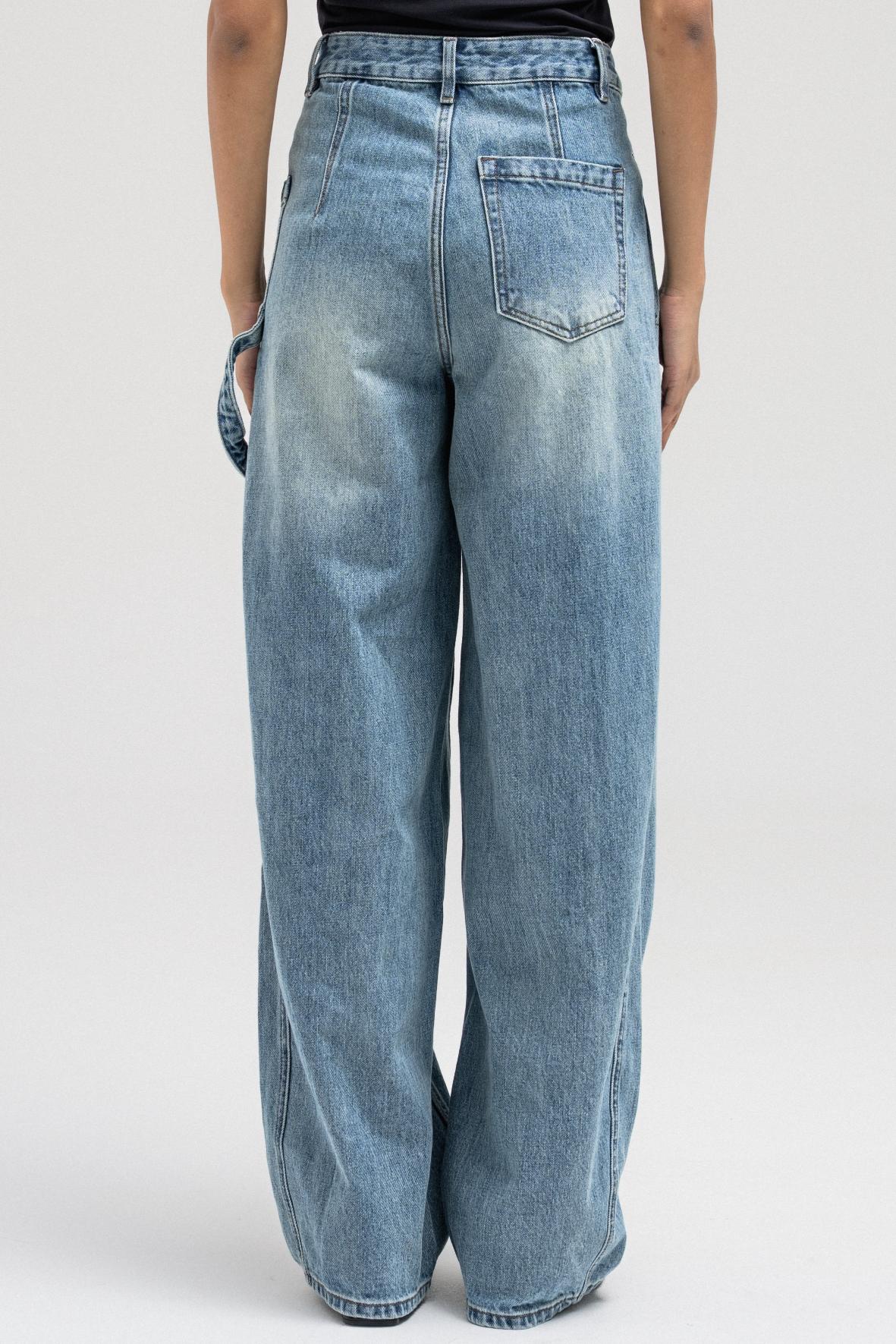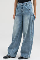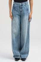 Light wash denim pants designed in a loose, baggy silhouette for a laid-back streetwear look. Features a front button and zipper closure, side pockets, and a single back pocket for minimal detailing.