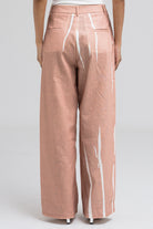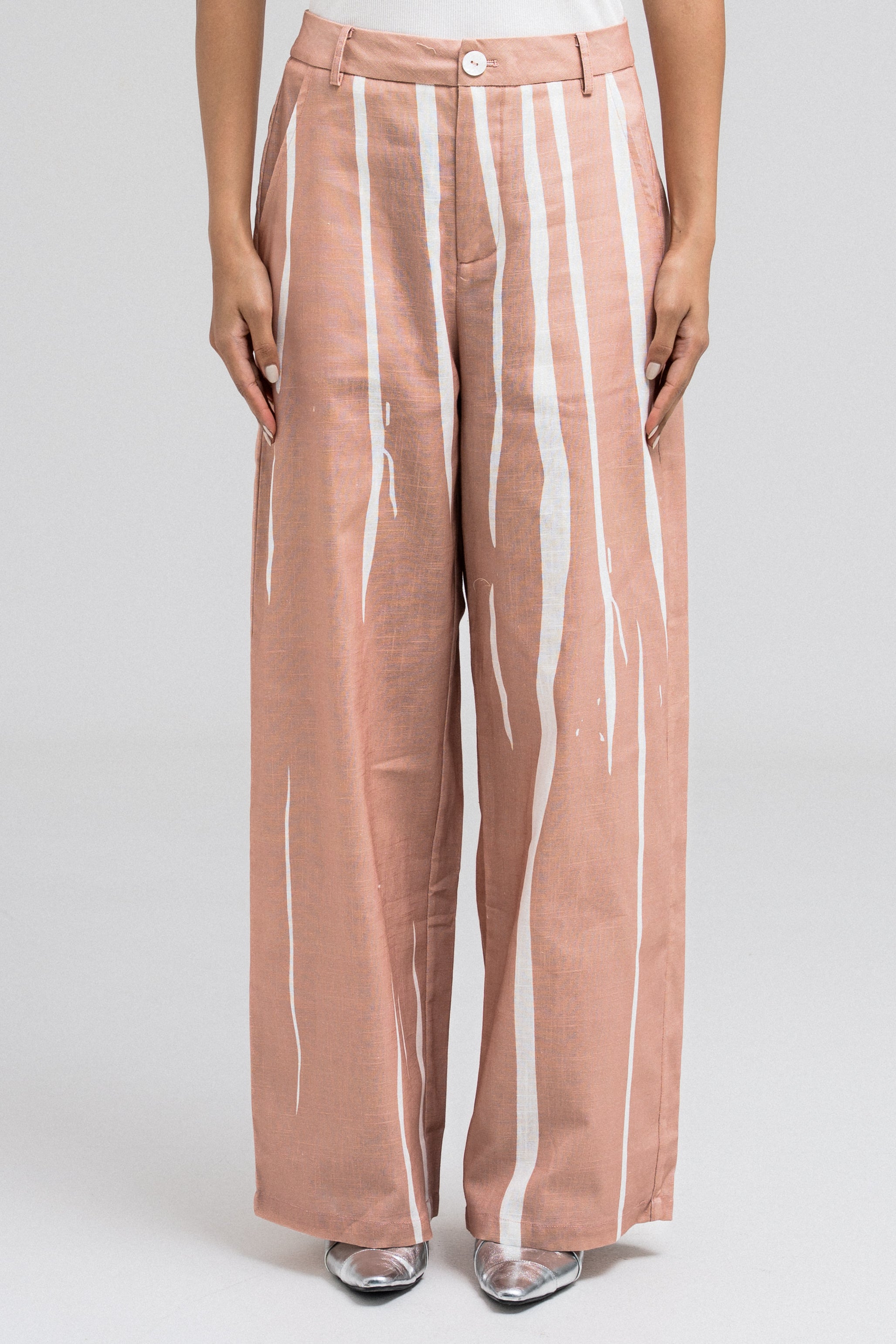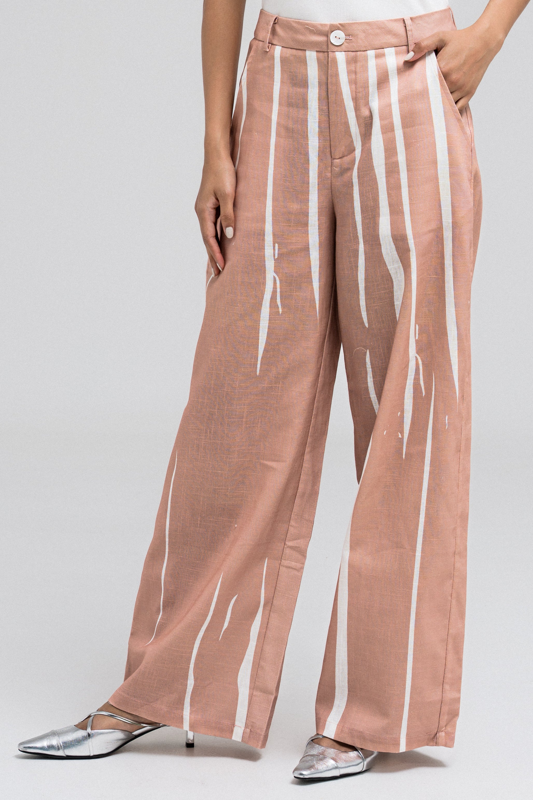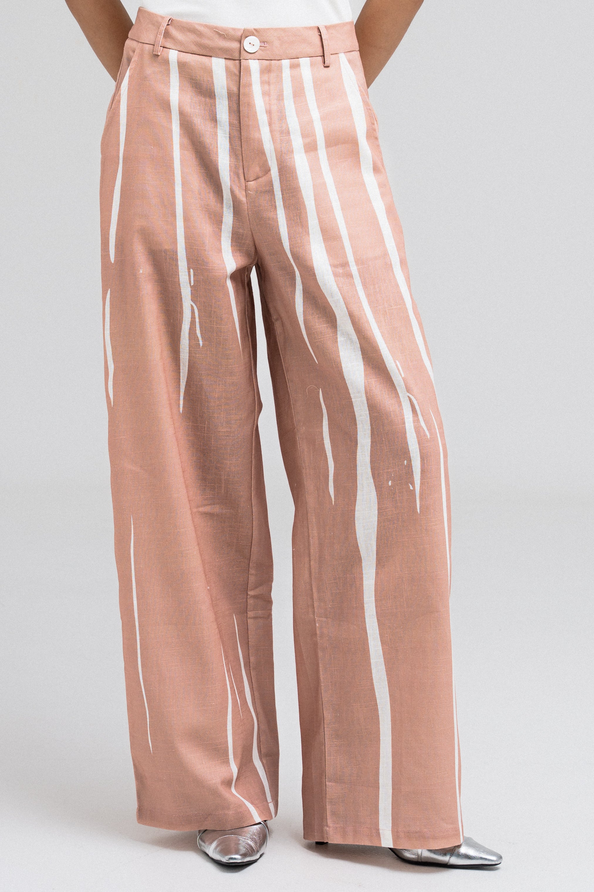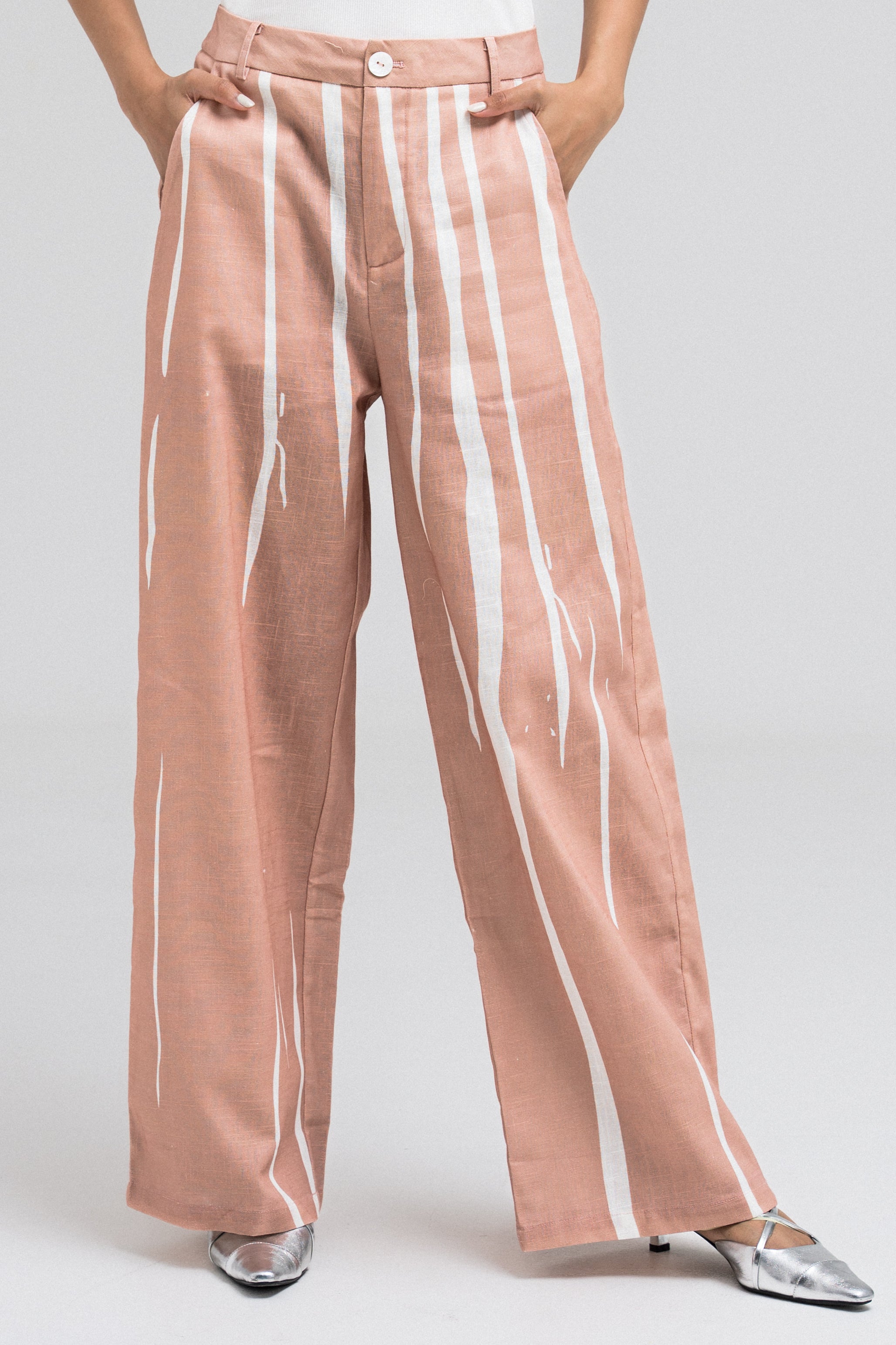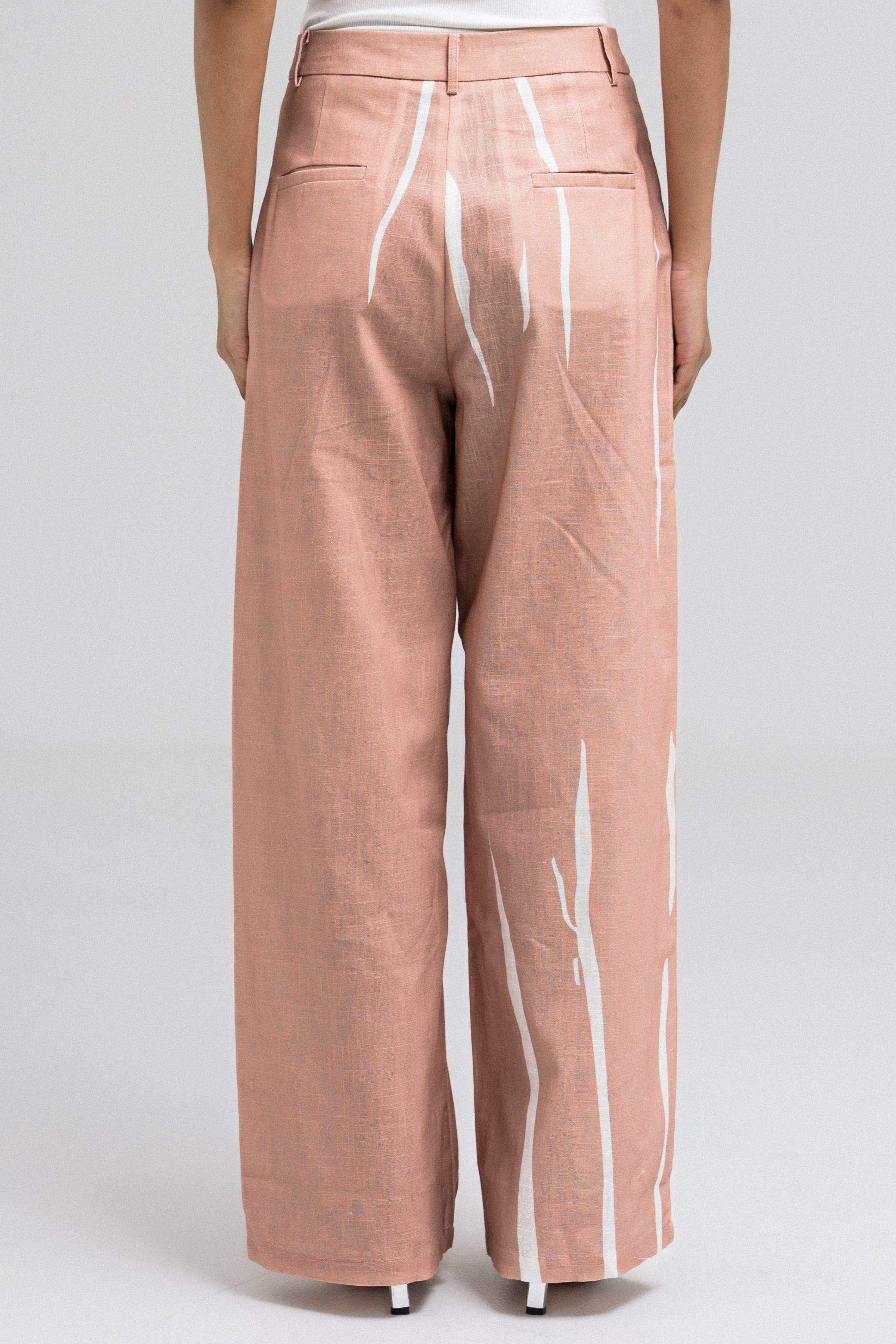 Pants are crafted from the same lightweight linen-like material as the blazer, featuring the same abstract white print over a blush pink base. Designed in a relaxed, wide-leg style, includes a front button and zipper closure. Perfect for pairing with the matching blazer for a coordinated outfit.