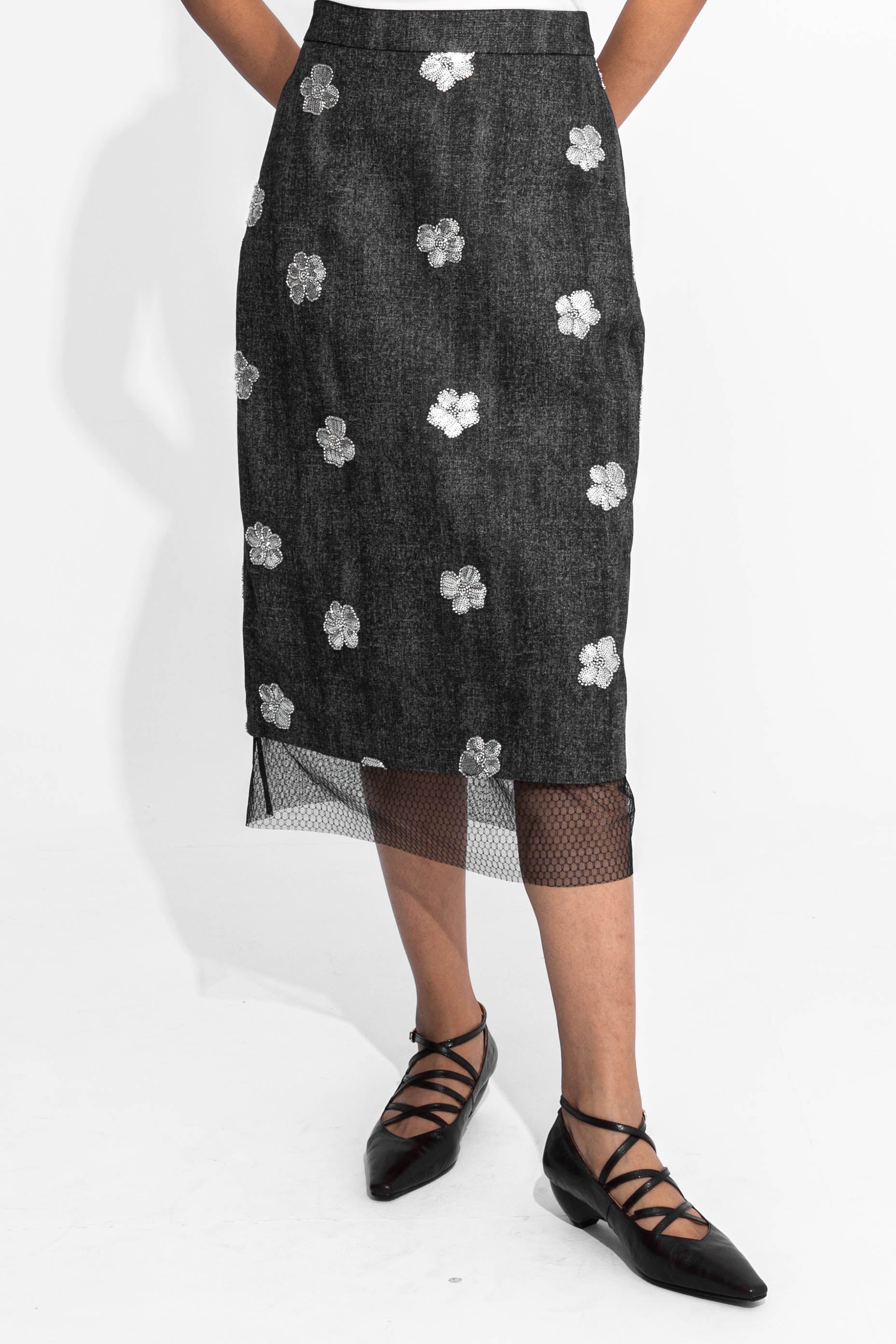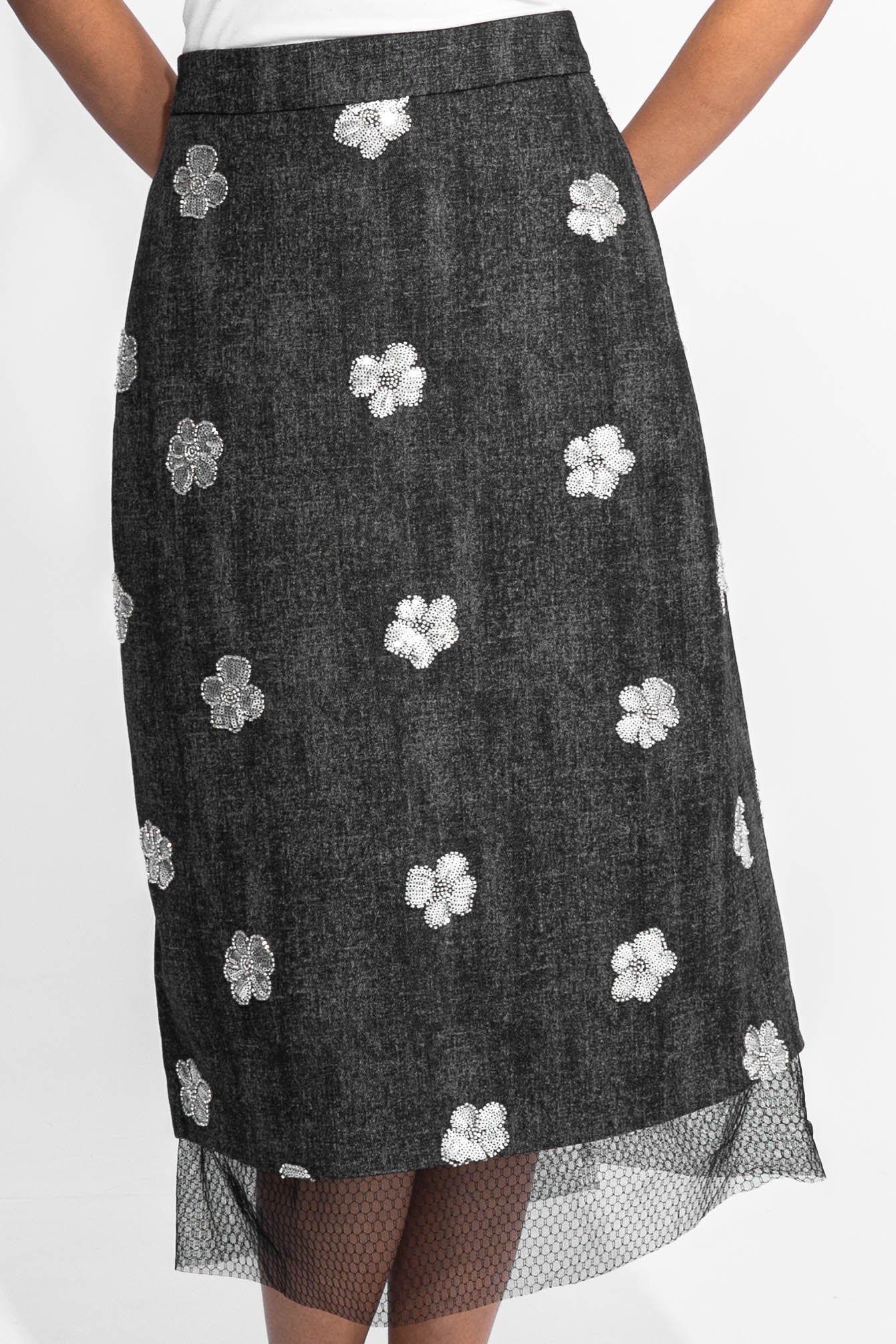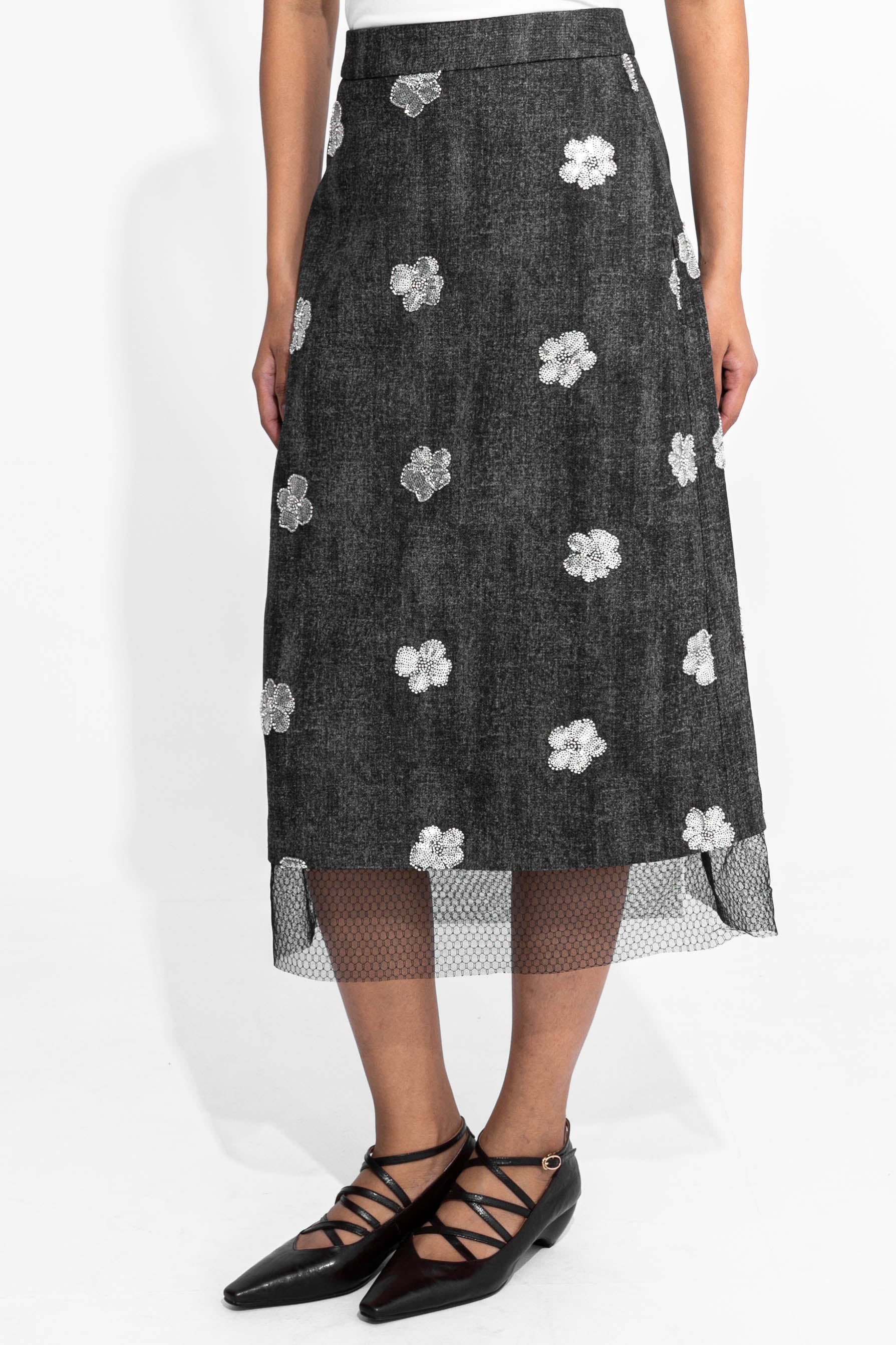 Netted fabric lining at the hem of the skirt. Side zip closure. Sequenced.