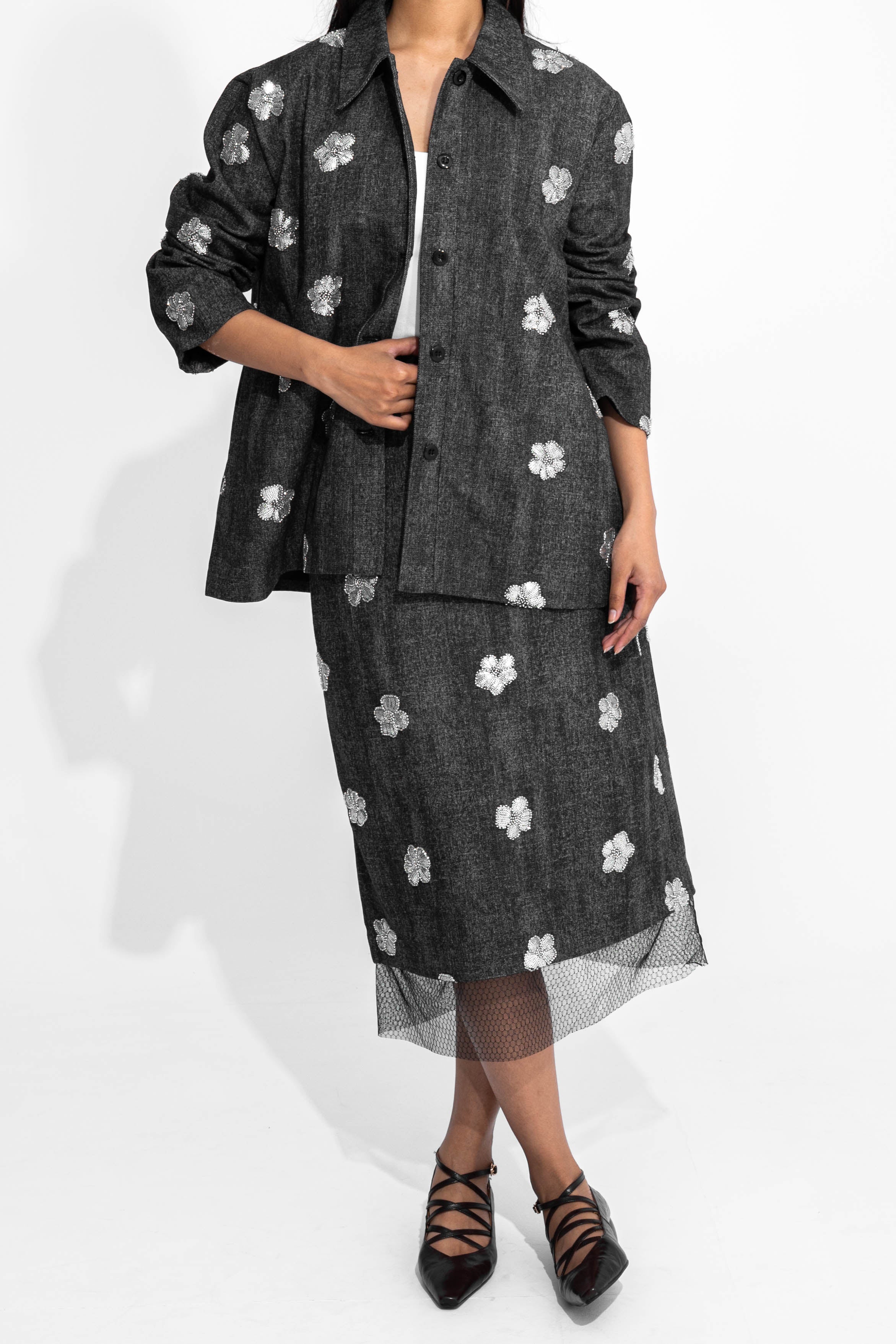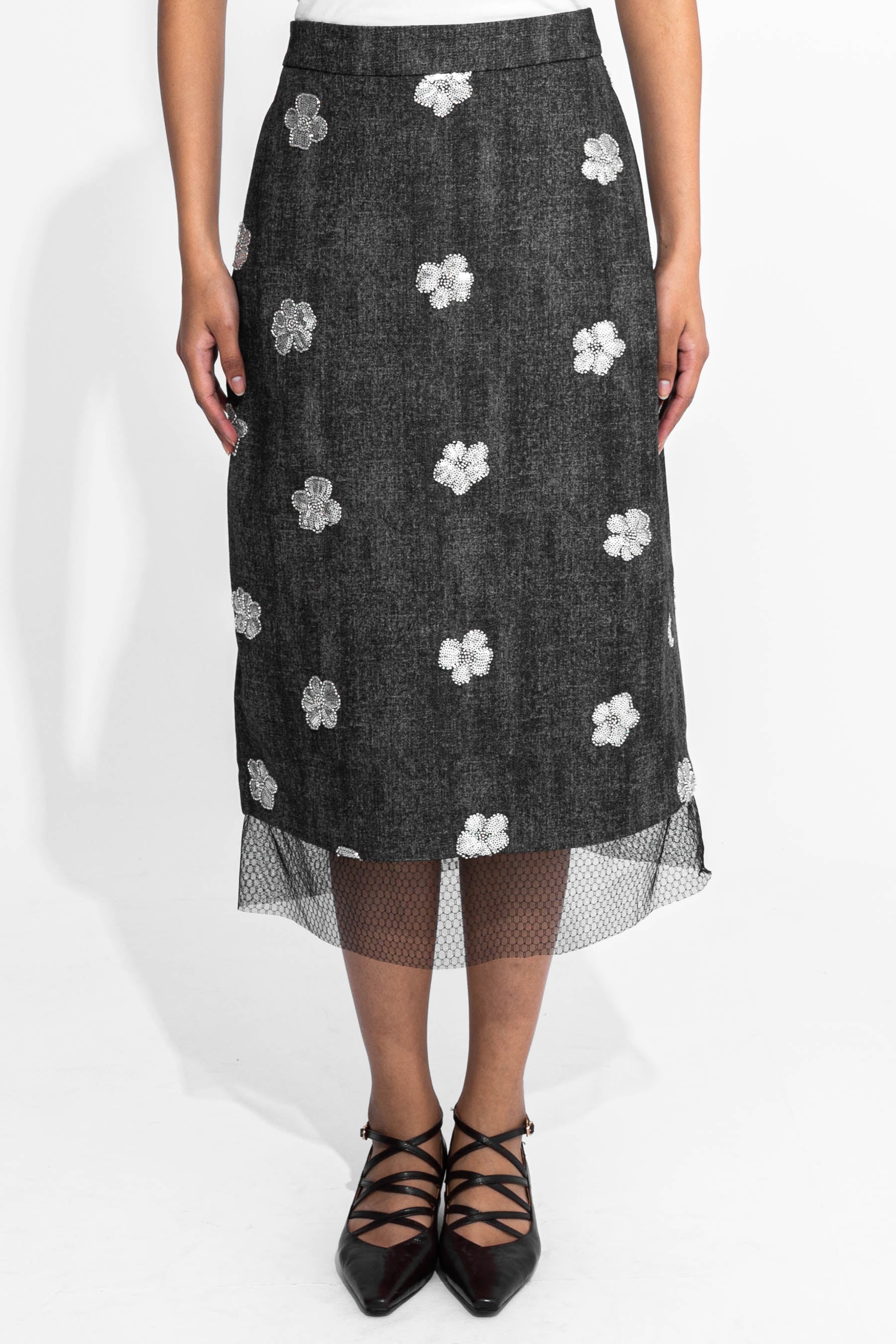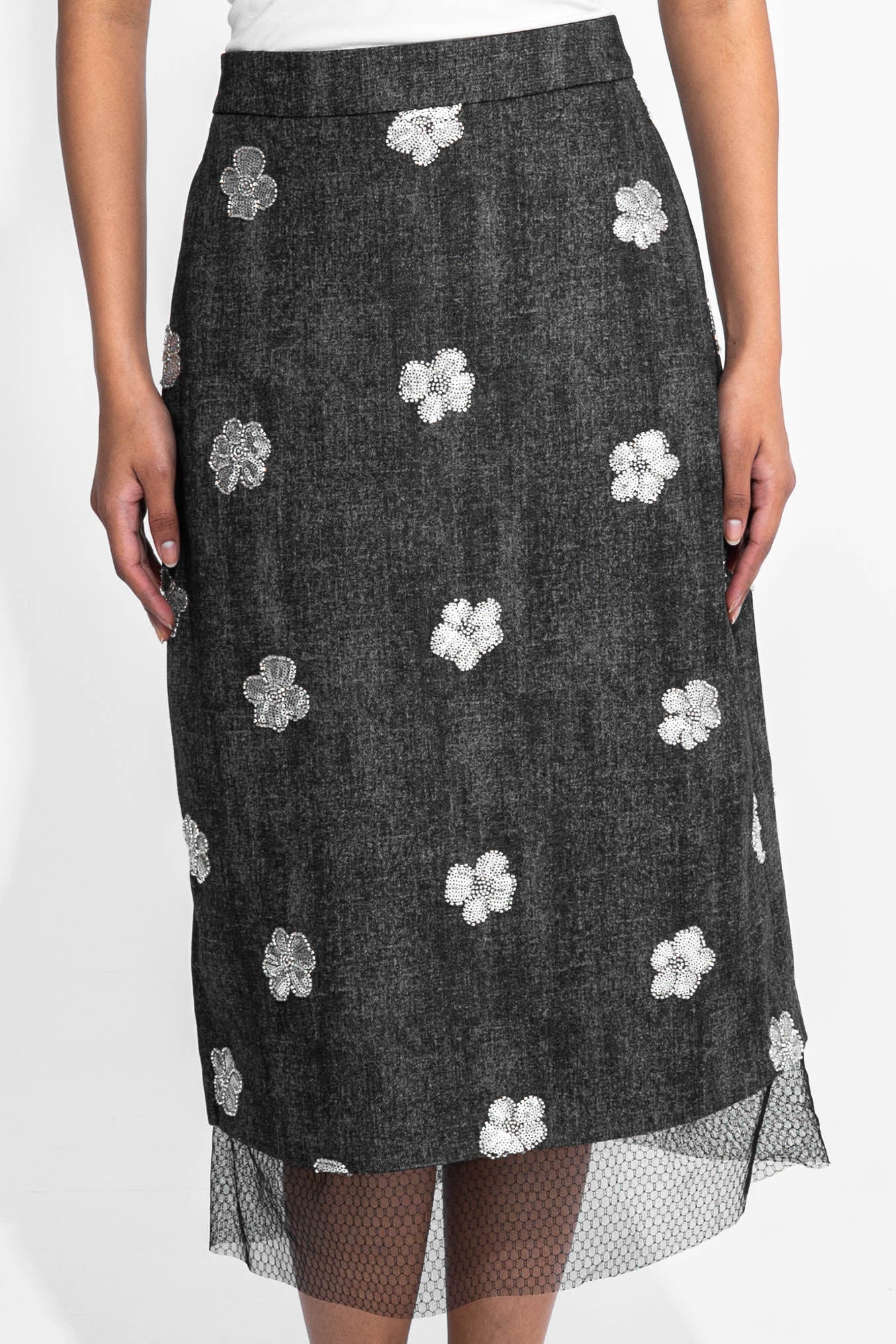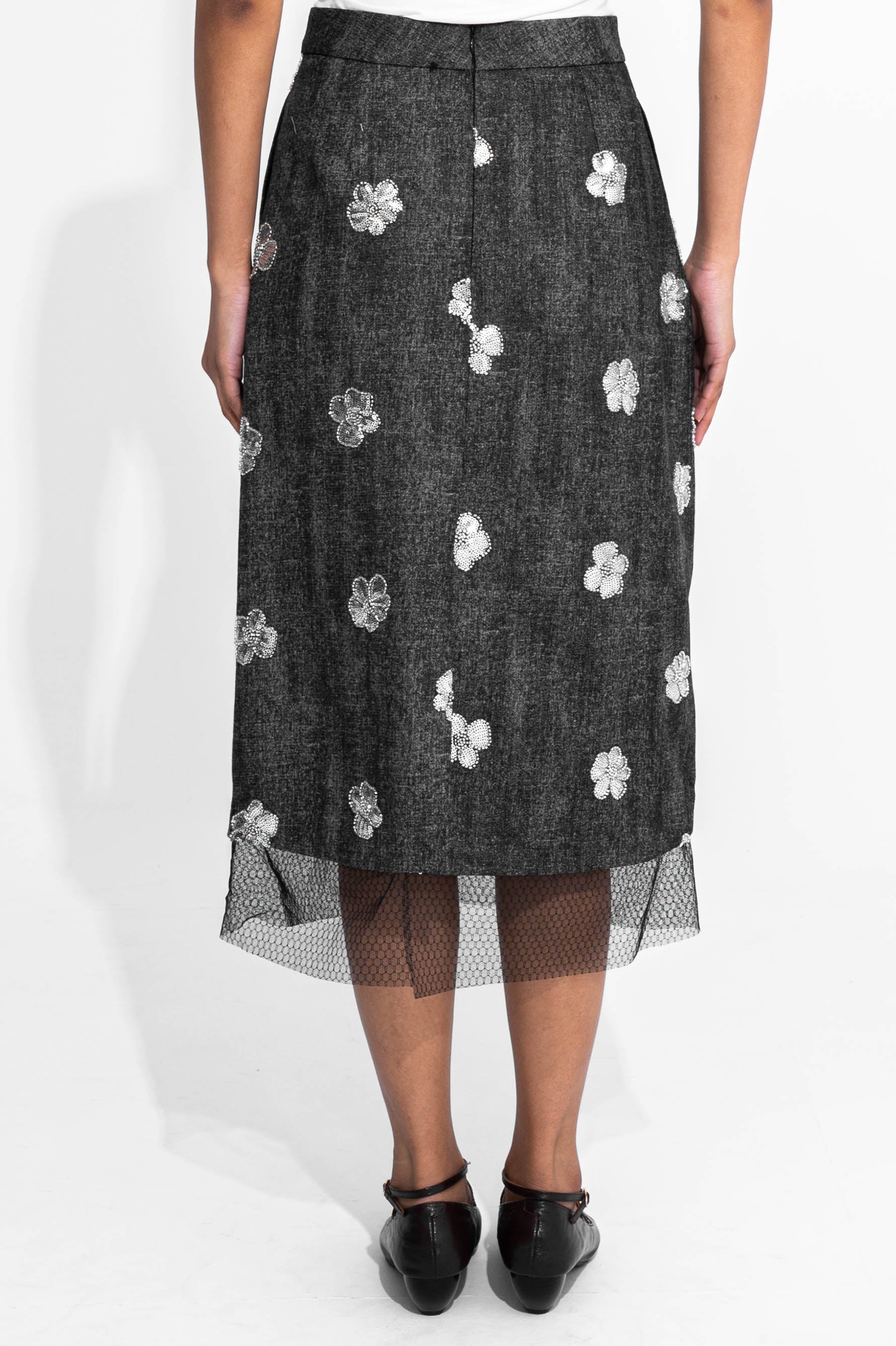 Netted fabric lining at the hem of the skirt. Side zip closure. Sequenced.