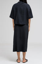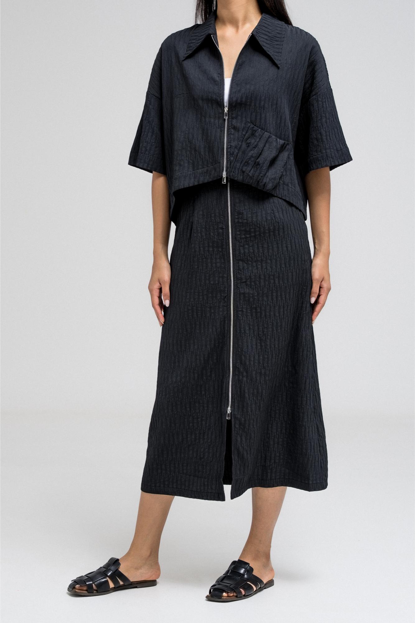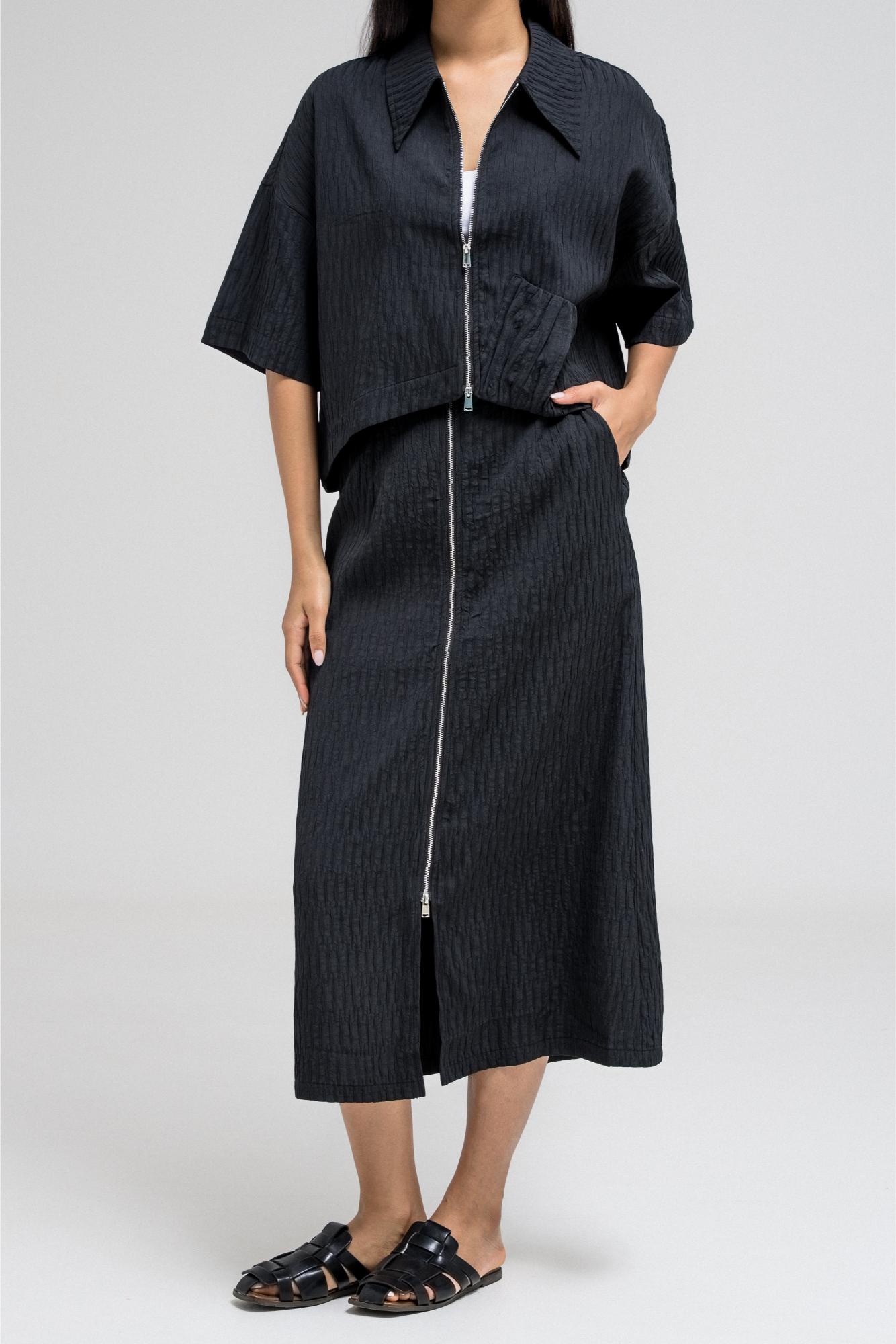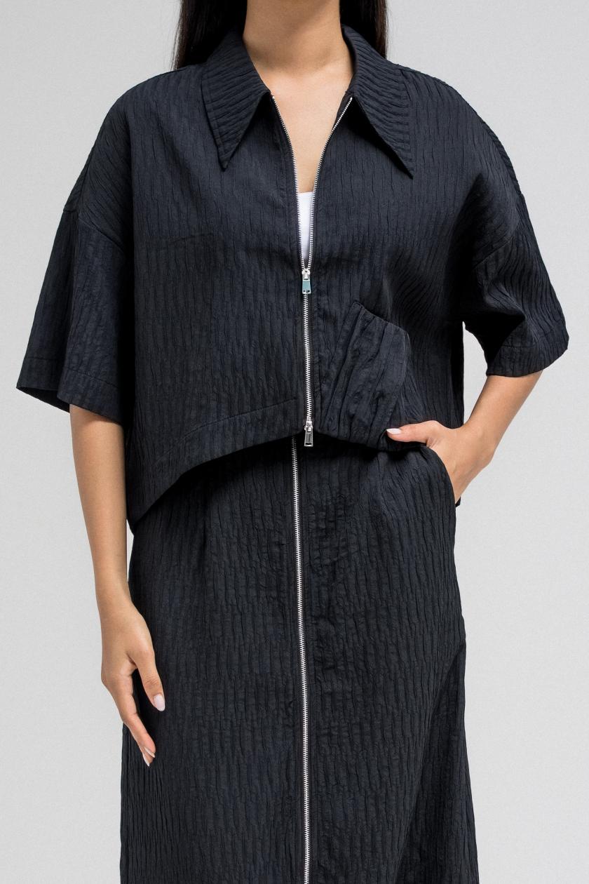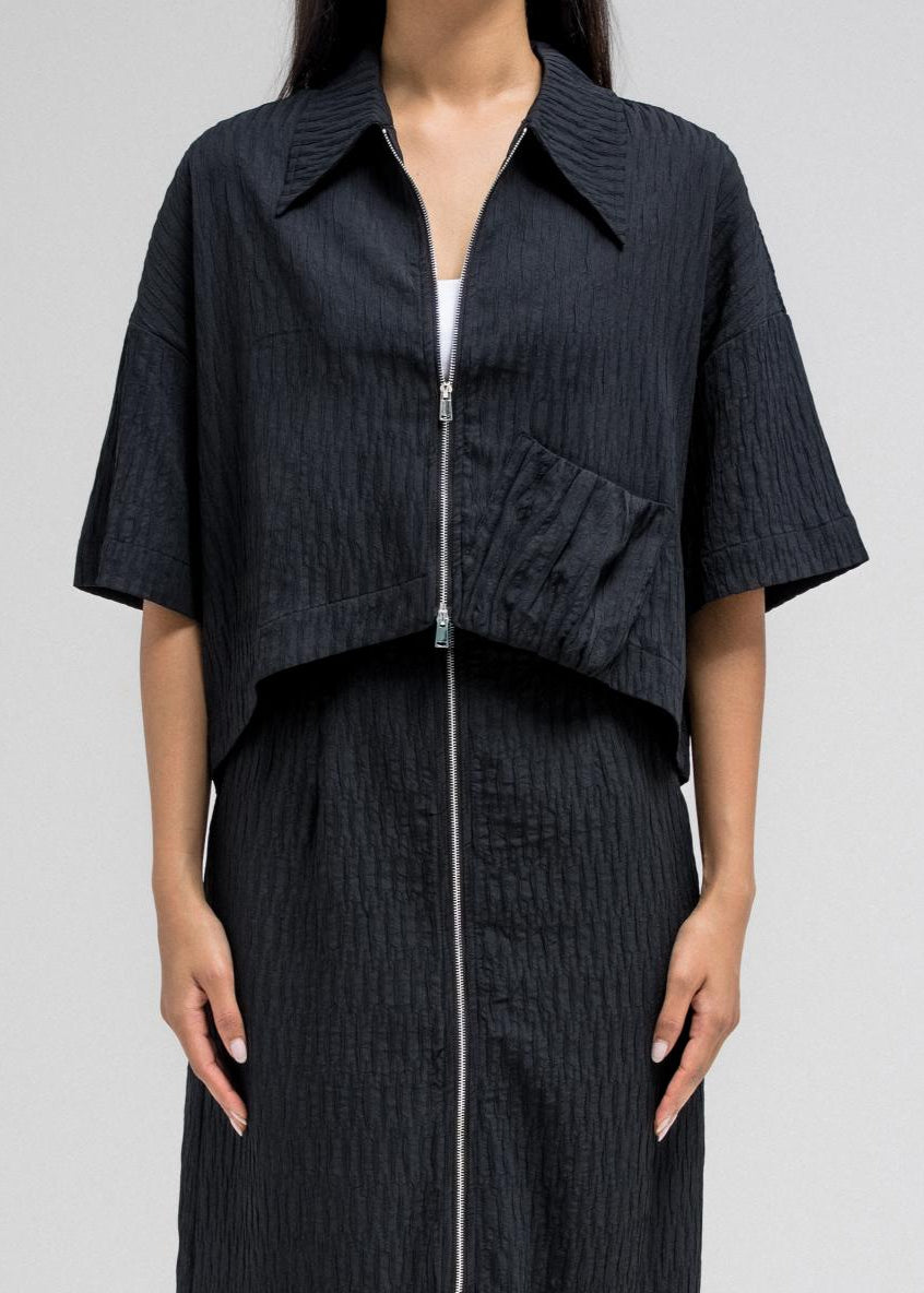 Cropped short sleeve top with a structured collar and front zip closure. Features a unique gathered pocket detail on one side. The fabric has a subtle textured pattern that adds depth to the look.
